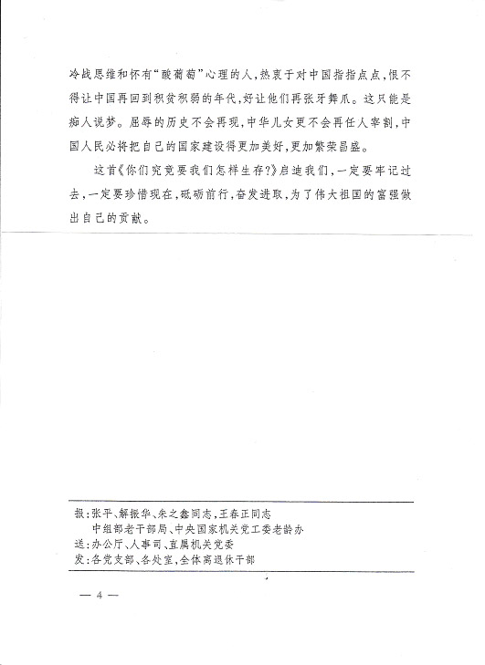 編者按:國家發(fā)改委離退休干部局《情況簡(jiǎn)報(bào)》今年第11期刊載《莫管他人言堅(jiān)走自己路——由〈你們究竟要我們?cè)鯓由??〉所想到的》,是一篇洋溢著愛國主義情懷的好詩文,現(xiàn)根據(jù)公司領(lǐng)導(dǎo)的指示予以轉(zhuǎn)載,請(qǐng)各支部作為黨史學(xué)習(xí)的生動(dòng)教材,激發(fā)全體同志堅(jiān)定永遠(yuǎn)跟著黨走的決心,堅(jiān)持走中國特色社會(huì)主義道路,為全面實(shí)現(xiàn)小康社會(huì)而努力奮斗。