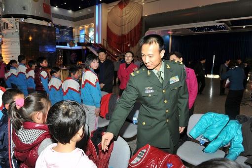 來到北京航天城 在航天城會(huì)展中心展廳,孩子們第一次見到了從前只能在電視里見到的英雄航天員費(fèi)俊龍。當(dāng)費(fèi)將軍走進(jìn)展廳時(shí),孩子們歡呼雀躍,激動(dòng)的心情寫在紅撲撲的小臉上。孩子們?yōu)橛⑿酆教靻T敬獻(xiàn)紅領(lǐng)巾和莊嚴(yán)的少先隊(duì)隊(duì)禮,以表達(dá)他們對(duì)航天員叔叔崇高的敬意和無(wú)限的敬仰之情。費(fèi)將軍與孩子們親切握手,鼓勵(lì)孩子們要熱愛黨、熱愛人民、熱愛偉大的祖國(guó),要勇敢、堅(jiān)強(qiáng),不怕困難,超越自我,珍惜現(xiàn)在的學(xué)習(xí)條件和所有人的關(guān)心幫助,努力學(xué)習(xí),真正成為中國(guó)特色社會(huì)主義事業(yè)的合格建設(shè)者和接班人!他在講話中表示,通過這次活動(dòng)能夠?yàn)楹⒆觽儷I(xiàn)上自己的愛心,積極履行社會(huì)責(zé)任,非常有意義。費(fèi)將軍還和國(guó)資委直屬機(jī)關(guān)黨委常務(wù)副書記曾堅(jiān)、企業(yè)改革局局長(zhǎng)白英姿、直屬機(jī)關(guān)工會(huì)主席呂秋菊以及中國(guó)航天科技集團(tuán)公司五院黨委書記李開民一起,把嶄新的學(xué)習(xí)用品送到孩子們手中。