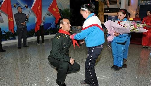 孩子們?yōu)橛⑿酆教靻T費(fèi)俊龍將軍佩戴紅領(lǐng)巾
