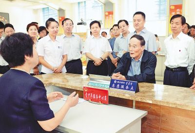 王岐山在哈爾濱市撫順社區(qū)辦事大廳調(diào)研。 新華社記者攝
