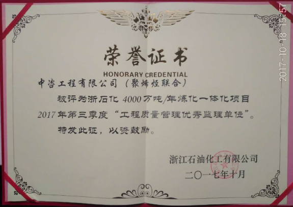 2017年10月,中咨工程有限公司浙石化聚烯烴聯(lián)合監(jiān)理部被業(yè)主浙江石油化工有限公司評(píng)為浙石化4000萬噸/年煉化一體化項(xiàng)目2017年第三季度“工程質(zhì)量管理優(yōu)秀監(jiān)理單位”。