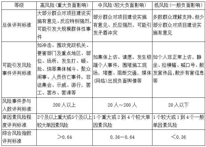 當(dāng)前社會(huì)普遍采用的以整體風(fēng)險(xiǎn)等級(jí)為導(dǎo)向的穩(wěn)評(píng)框架提出了投資項(xiàng)目社會(huì)穩(wěn)定風(fēng)險(xiǎn)等級(jí)判斷的五個(gè)“標(biāo)準(zhǔn)”,如下表所示。