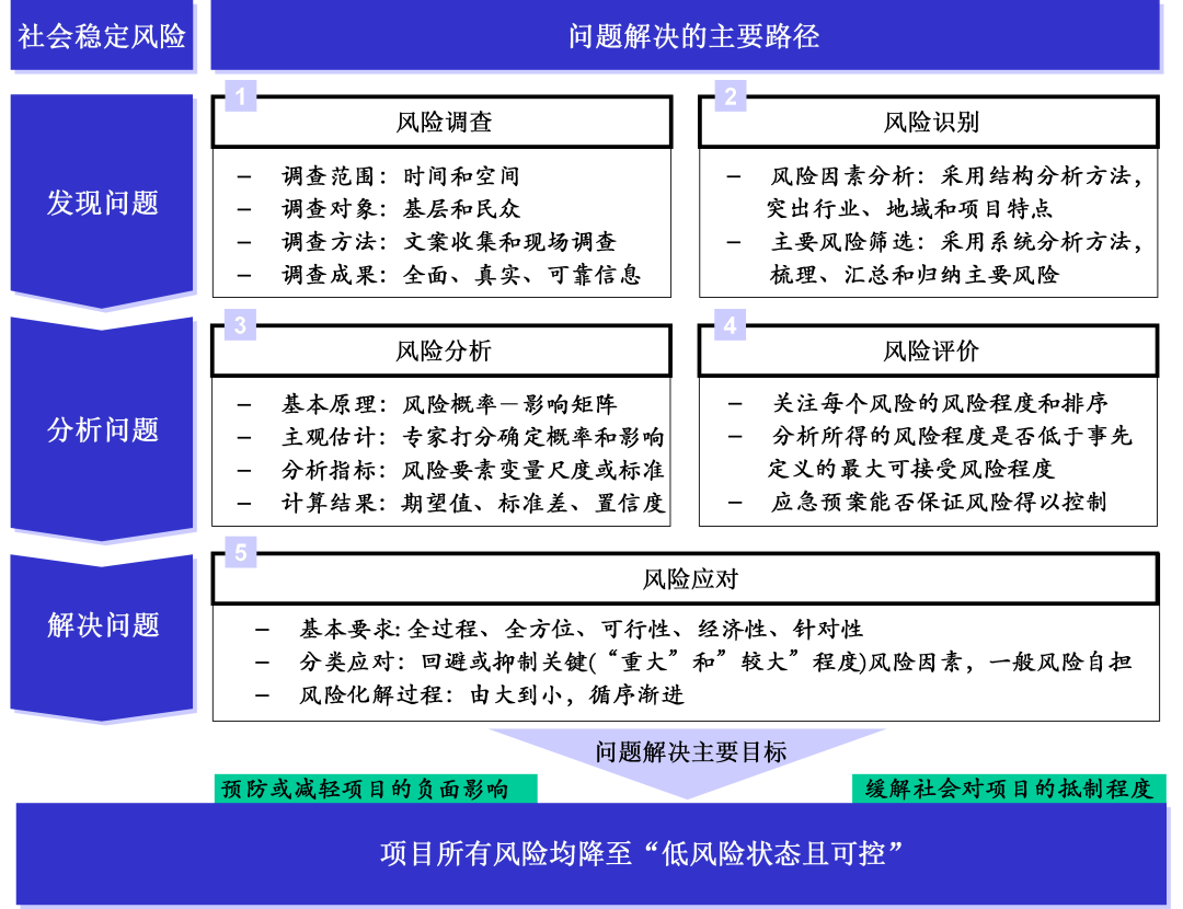 以問(wèn)題解決為導(dǎo)向的項(xiàng)目穩(wěn)評(píng)框架,是以項(xiàng)目所有社會(huì)穩(wěn)定風(fēng)險(xiǎn)均處于“低風(fēng)險(xiǎn)狀態(tài)且可控”為目標(biāo),以預(yù)防和化解影響社會(huì)穩(wěn)定各主要風(fēng)險(xiǎn)為主線,遵循發(fā)現(xiàn)問(wèn)題—分析問(wèn)題—解決問(wèn)題的研究思路,在對(duì)可能引發(fā)社會(huì)不穩(wěn)定后果的各種風(fēng)險(xiǎn)因素進(jìn)行調(diào)查、識(shí)別和分析的基礎(chǔ)上,評(píng)價(jià)各風(fēng)險(xiǎn)是否均處于低風(fēng)險(xiǎn)狀態(tài),且可采取有效措施來(lái)確保引發(fā)社會(huì)穩(wěn)定風(fēng)險(xiǎn)的因素能夠得到有效控制。風(fēng)險(xiǎn)防范和化解是一個(gè)循序漸進(jìn)的過(guò)程,對(duì)于仍然存在不屬于“低風(fēng)險(xiǎn)狀態(tài)且可控”的風(fēng)險(xiǎn),應(yīng)進(jìn)一步研究提出化解措施,直至所有風(fēng)險(xiǎn)(包括剩余風(fēng)險(xiǎn))均處于“低風(fēng)險(xiǎn)狀態(tài)且可控”,或者采取風(fēng)險(xiǎn)應(yīng)對(duì)進(jìn)一步措施的代價(jià)超出預(yù)期為止。