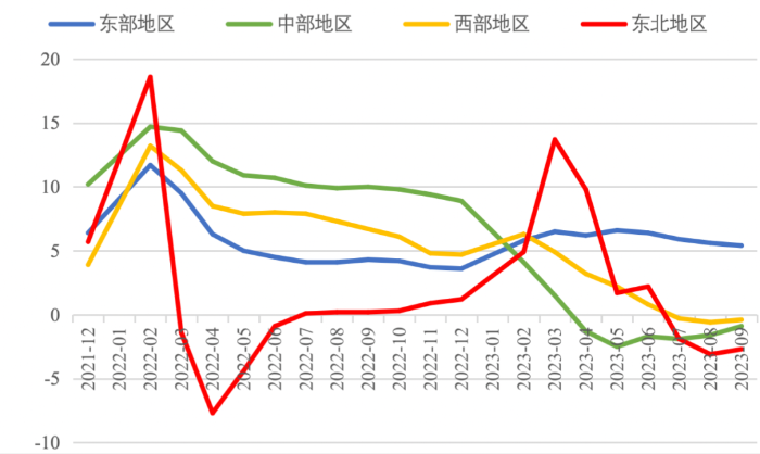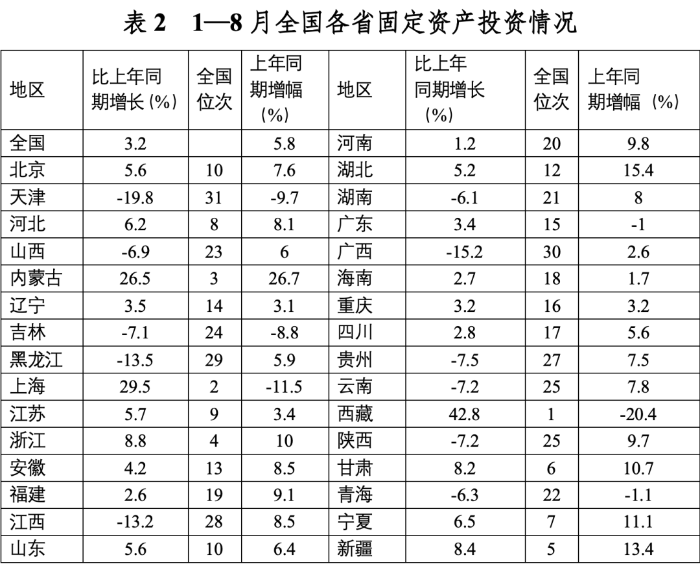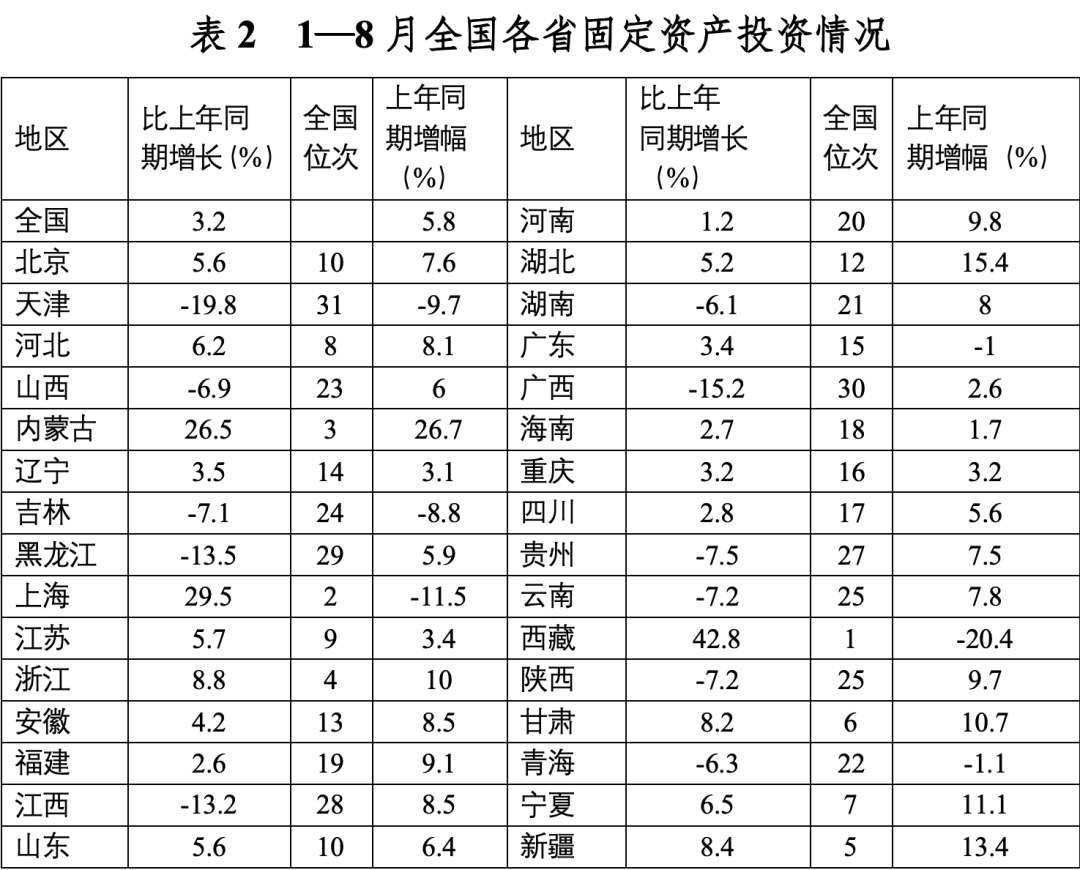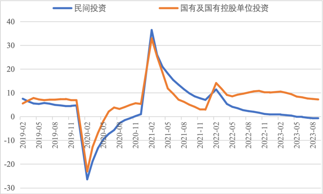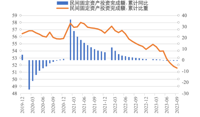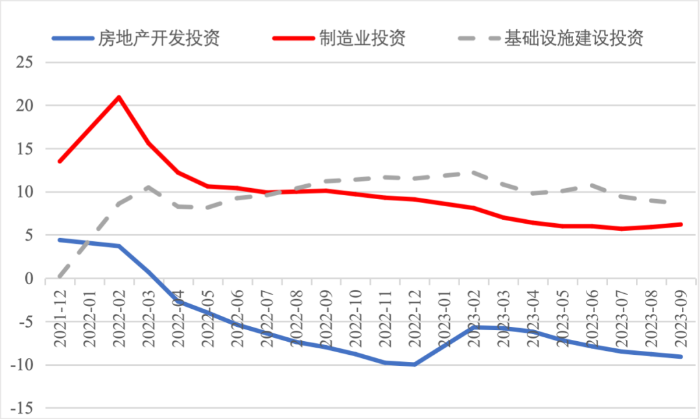2023年前三季度,我國經(jīng)濟(jì)運行持續(xù)恢復(fù)向好,投資對優(yōu)化供給結(jié)構(gòu)的關(guān)鍵作用顯著增強,高技術(shù)產(chǎn)業(yè)投資保持較快增長,基礎(chǔ)設(shè)施投資、制造業(yè)投資穩(wěn)投資支撐作用進(jìn)一步發(fā)揮。同時,當(dāng)前穩(wěn)投資也面臨新的困難挑戰(zhàn),尤其是房地產(chǎn)市場深度調(diào)整導(dǎo)致房地產(chǎn)開發(fā)投資和民間投資承受較大下行壓力。下一步仍需精準(zhǔn)有力加強逆周期調(diào)控,不斷拓展促投資政策空間,重點圍繞提振房地產(chǎn)市場、推動制造業(yè)轉(zhuǎn)型升級、激發(fā)民間投資活力等方面,繼續(xù)夯實投資復(fù)蘇基礎(chǔ)。 一、固定資產(chǎn)投資整體運行情況 (一)整體投資保持平穩(wěn)增長態(tài)勢       2023年1—9月,我國固定資產(chǎn)投資(不含農(nóng)戶,下同)375035億元,同比增長3.1%,較國內(nèi)生產(chǎn)總值增速低了2.1個百分點,較上半年增速低了0.7個百分點,固定資產(chǎn)投資增速持續(xù)放緩。從投資構(gòu)成看,上半年建安工程、設(shè)備工器具購置、其他費用分別增長2.4%、6.8%、3.1%。設(shè)備工器具購置保持較快增長,反映在各類政策工具支持引導(dǎo)下,企業(yè)設(shè)備購置、技術(shù)改造投入力度加大。 圖1 全國固定資產(chǎn)投資增速(%) 數(shù)據(jù)來源:國家統(tǒng)計局 (二)民間投資意愿和能力仍待恢復(fù)       2023年1—9月,民間固定資產(chǎn)投資為193399億元,同比下降0.6%,較上半年低了0.4個百分點,低于投資整體增速3.7個百分點。從季度波動看,民間固定資產(chǎn)投資的增速由2022年第一季度的8.4%持續(xù)下滑,并連續(xù)兩個季度負(fù)增長。民間固定資產(chǎn)投資占比進(jìn)一步萎縮,跌至2011年以來的最低點,僅為51.57%。 圖2 民間投資增速及占比(%) 數(shù)據(jù)來源:國家統(tǒng)計局,Wind數(shù)據(jù)庫       國家統(tǒng)計局發(fā)布信息顯示,房地產(chǎn)投資中約80%為民間投資。受房地產(chǎn)市場深度調(diào)整影響,民間投資動力和能力相對不足,國有及國有控股單位投資增速連續(xù)20個月高于民間投資增速。2023年1—9月,國有及國有控股單位同比增長7.2%,較民間投資增速高了7.8個百分點。 圖3 民間投資、國有及國有控股單位投資增速(%) 數(shù)據(jù)來源:國家統(tǒng)計局,Wind數(shù)據(jù)庫 (三)制造業(yè)投資保持較快增長,基礎(chǔ)設(shè)施補短板投入加大       2023年1—9月,制造業(yè)和基建投資保持較快增長,房地產(chǎn)投資持續(xù)負(fù)增長,且降幅有所擴(kuò)大?;A(chǔ)設(shè)施投資在專項債等融資支持政策以及重大項目支撐下,效果持續(xù)顯現(xiàn),前三季度基礎(chǔ)設(shè)施投資同比增長8.64%,高于全部投資5.54個百分點,是三大類投資中增長最快的領(lǐng)域。其中,鐵路運輸業(yè)、倉儲業(yè)投資分別大幅增長22.1%、27.7%。截至9月底,新增地方政府專項債已發(fā)行超過3.1萬億元,完成全年專項債額度的80%以上,對基礎(chǔ)設(shè)施投資形成較強支撐。1—9月份,計劃總投資億元及以上項目投資同比增長10.2%,較1—8月快了0.3個百分點,對全部投資增長的貢獻(xiàn)率達(dá)169.2%,大項目投資帶動作用明顯。 數(shù)據(jù)來源:國家統(tǒng)計局,Wind數(shù)據(jù)庫 2023年1—9月,制造業(yè)投資同比增長6.2%,比整體投資高3.1個百分點。其中,高技術(shù)制造業(yè)投資同比增長11.3%,對制造業(yè)投資拉動作用明顯,表明我國制造業(yè)加速轉(zhuǎn)型升級。9月,制造業(yè)采購經(jīng)理指數(shù)(PMI)為50.2%,比上月上升0.5個百分點,重返擴(kuò)張區(qū)間。生產(chǎn)指數(shù)和新訂單指數(shù)均高于臨界點,分別為52.7%和50.5%,表明制造業(yè)生產(chǎn)和市場需求穩(wěn)步回升。裝備制造業(yè)、高技術(shù)制造業(yè)PMI分別為50.6%、50.1%,均位于擴(kuò)張區(qū)間。從企業(yè)規(guī)??矗?、中、小型企業(yè)PMI分別為51.6%、49.6%和48%,其中大型企業(yè)PMI較上月回升0.8個百分點,為近6個月高點,表現(xiàn)出強勁恢復(fù)發(fā)展動能。 圖4:制造業(yè)PMI指數(shù)(%) 數(shù)據(jù)來源:國家統(tǒng)計局,Wind數(shù)據(jù)庫 2023年1—9月,房地產(chǎn)開發(fā)投資增速持續(xù)放緩,房地產(chǎn)開發(fā)投資、住宅開發(fā)投資分別同比下降9.1%、8.4%。房地產(chǎn)開發(fā)投資占固定資產(chǎn)投資完成額的比重降至23.3%,較上半年下降0.8個百分點,為今年以來最低值。房屋施工面積、房屋新開工面積等先行指標(biāo)均出現(xiàn)明顯下滑,分別同比下降7.1%、23.4%。1—9月,國房景氣指數(shù)均位于100以下,自4月以來持續(xù)走低。 圖5  三大領(lǐng)域固定資產(chǎn)投資增速(累計同比,%) 數(shù)據(jù)來源:國家統(tǒng)計局,Wind數(shù)據(jù)庫 (四)東部地區(qū)投資保持較快增長,東北地區(qū)投資下滑明顯       從投資地域看,三季度東北地區(qū)投資轉(zhuǎn)為負(fù)增長,1—9月累計同比下降2.7%,較全國水平低了5.8個百分點。東部地區(qū)投資同比增長5.4%,保持較高增速。西部地區(qū)投資同比微降0.4%,增速由正轉(zhuǎn)負(fù)。中部地區(qū)投資同比下降0.9%,降幅較上半年收窄0.8個百分點。 圖6 分地區(qū)固定資產(chǎn)投資增速(累計同比,%) 數(shù)據(jù)來源:國家統(tǒng)計局,Wind數(shù)據(jù)庫 1—8月,31個省份中有15個省投資增速高于全國水平,其