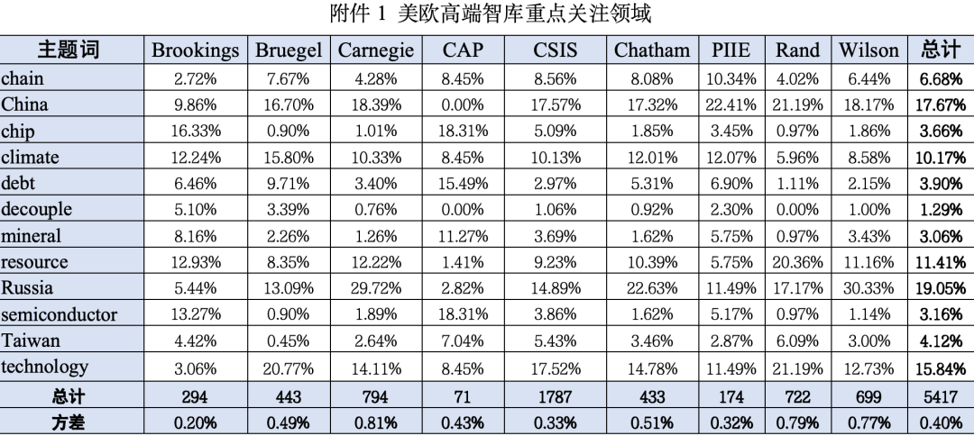 一、研究背景 美歐智庫是全球智庫體系中的重要組成部分,其發(fā)展起步較早,發(fā)展模式較好,行業(yè)規(guī)范更成熟,是美歐國家的重要政策智囊,在全球高端輿論體系中有著重要的地位??傮w來看,美歐智庫在數(shù)量和影響力方面處于世界領(lǐng)先地位,其發(fā)布的觀點、分析和評論也成為了當(dāng)下了解美歐國家政府內(nèi)部認(rèn)知和社會公共輿論的一扇重要窗口。 一般對于智庫的研究報告都以文獻(xiàn)閱讀、分析、總結(jié)為主,多針對一篇或幾篇報告進(jìn)行分析。這種研究方式的優(yōu)勢是分析更為透徹和深入,但是由于個人精力、關(guān)注方向的局限性,容易陷入“信息繭房”,對整體方向的把握比較散亂。本報告屬于美歐智庫成果大數(shù)據(jù)研究系列,旨在持續(xù)跟蹤美歐智庫研究動向,更全面了解美歐國家對國際政治、經(jīng)濟貿(mào)易、中國發(fā)展等關(guān)鍵領(lǐng)域的認(rèn)知情況。 二、樣本選取 研究樣本選取美國布魯金斯學(xué)會(Brookings)、美國卡內(nèi)基國際和平基金會(Carnegie)、比利時布魯蓋爾研究所(Bruegel)、美國戰(zhàn)略與國際問題研究中心(CSIS)、英國皇家國際事務(wù)研究所(Chatham)、美國蘭德公司(Rand)、美國彼得森國際經(jīng)濟研究所(PIIE)、威爾遜中心(Wilson)和美國進(jìn)步中心(CAP)等9家智庫。 樣本報告研究覆蓋關(guān)于中國、產(chǎn)業(yè)鏈、芯片、氣候、債務(wù)、脫鉤、礦物、資源、俄羅斯、半導(dǎo)體、臺灣、技術(shù)等相關(guān)領(lǐng)域的研究報告,共計5417篇。 三、文本數(shù)據(jù)分析 (一)各智庫關(guān)注領(lǐng)域 2023上半年,各歐美智庫與中國、俄羅斯等相關(guān)的主題報告占比在五分之二左右,與供應(yīng)鏈、芯片產(chǎn)業(yè)、半導(dǎo)體產(chǎn)業(yè)、礦產(chǎn)產(chǎn)業(yè)、脫鉤等相關(guān)的主題報告占比在五分之一左右,與氣候、資源、債務(wù)等相關(guān)的主題報告占比約五分之一,與臺灣、科技主題相關(guān)的報告約占五分之一。不同主題下智庫關(guān)注的重點領(lǐng)域分析參見附件1。 1.布魯蓋爾:中國和科技 布魯蓋爾研究所注重中國問題和科技前沿產(chǎn)業(yè)的研究。在限制中國科技發(fā)展的問題上,布魯蓋爾指出,越來越多的研究員擔(dān)心美國在基礎(chǔ)研究方面的開放可能過于支持競爭對手。隨著科技水平在一些關(guān)鍵領(lǐng)域取得的重大突破、全球化信息環(huán)境的形成、以及國際經(jīng)濟聯(lián)系的深化和多樣化,各國的相互依存將不可分離,高技術(shù)產(chǎn)業(yè)針對某一國家和地區(qū)進(jìn)行全面封鎖將愈加困難。在科技前沿產(chǎn)業(yè)研究中,布魯蓋爾對由國防部、聯(lián)合作戰(zhàn)指揮部、海軍、海軍陸戰(zhàn)隊、國防機構(gòu)和國防情報部門聯(lián)合資助的蘭德公司國防研究所進(jìn)行了重點分析,認(rèn)為美國應(yīng)繼續(xù)通過軍工聯(lián)合體推進(jìn)前沿科技轉(zhuǎn)化的研究工作。 2.布魯金斯:芯片和資源 布魯金斯學(xué)會的研究領(lǐng)域較為廣泛,其研究相對側(cè)重芯片和資源。布魯金斯認(rèn)為美國利用其在國際組織如多邊開發(fā)銀行中的股權(quán)影響力,支持美國在外交、安全和經(jīng)濟方面的政策和活動,特別是對芯片技術(shù)的封鎖。布魯金斯通過對關(guān)鍵礦產(chǎn)供應(yīng)問題的大量分析,如美國和日本宣布的關(guān)于電池礦物采購、美國對加拿大礦業(yè)項目的融資貿(mào)易協(xié)議,提出應(yīng)加強關(guān)注部分關(guān)鍵產(chǎn)業(yè)供應(yīng)鏈上游礦產(chǎn)品,目前美國部分利益團體已經(jīng)加強該類產(chǎn)品的供應(yīng)安全,對相關(guān)風(fēng)險有所警惕和防范。 3.卡內(nèi)基:中國和俄羅斯 卡內(nèi)基國際和平基金會的研究具有鮮明的特色,以俄羅斯、中國問題為研究重點,相關(guān)報告約占其研究報告總量的一半。針對俄羅斯,卡內(nèi)基提出目前正在美國執(zhí)行的三大舉措包括加強對烏克蘭的戰(zhàn)爭支持、維持對俄羅斯的制裁和加強北約的東部防線,成功搭建了遏制俄羅斯發(fā)展的政策框架,未來應(yīng)立足這三大核心進(jìn)一步強化對俄政策。圍繞烏克蘭提出的《基輔安全協(xié)議保障草案》,美國仍在權(quán)衡是否將目前的支持轉(zhuǎn)化為更持久的框架。卡內(nèi)基提出,美國對烏克蘭的軍事援助已經(jīng)在美國政府內(nèi)部產(chǎn)生爭議,特別是美國總統(tǒng)選舉即將到來的窗口期日益臨近,各個候選人團隊會在這段時間重新研究對烏援助計劃,以爭取選民和國內(nèi)各勢力的最大限度支持。針對中國,卡內(nèi)基多名研究員提出拜登政府的國家安全戰(zhàn)略將中國作為最重要的地緣政治挑戰(zhàn),未來會加強澳大利亞、英國和美國組成的三方安全伙伴關(guān)系,將其逐步培養(yǎng)成印太地區(qū)最強大的軍事力量之一。 4.蘭德:中國、俄羅斯和科技 蘭德公司延續(xù)了其對中國、俄羅斯和科技前沿的關(guān)注。蘭德重點分析和權(quán)衡了中俄戰(zhàn)略地位,雖然短期內(nèi)美國由于烏克蘭戰(zhàn)爭而全面回歸歐洲安全事務(wù),但是長期來看美國的戰(zhàn)略關(guān)注重點仍然是中國。同時,部分研究提出對烏克蘭的援助不僅是對一個主權(quán)國家生存空間的支持,也可以將烏克蘭視為一個潛在的投資