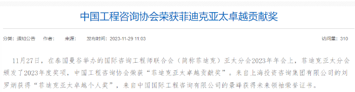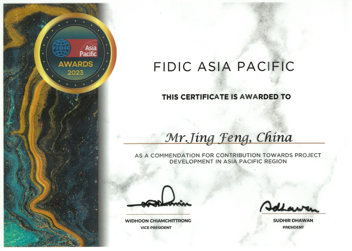 2023年,國際咨詢工程師聯(lián)合會(huì)(簡(jiǎn)稱菲迪克)喜訊頻傳。中咨公司繼“金沙江白鶴灘水電站”榮獲菲迪克2023年度卓越工程項(xiàng)目獎(jiǎng)、“福建福清核電5、6號(hào)機(jī)組”榮獲優(yōu)秀工程項(xiàng)目獎(jiǎng),在11月27日泰國曼谷舉辦的菲迪克亞太分會(huì)2023年年會(huì)上,中咨公司員工景峰榮獲菲迪克亞太未來領(lǐng)袖榮譽(yù)稱號(hào)。這也是經(jīng)公司推薦獲得的首個(gè)工程師獎(jiǎng)項(xiàng)。