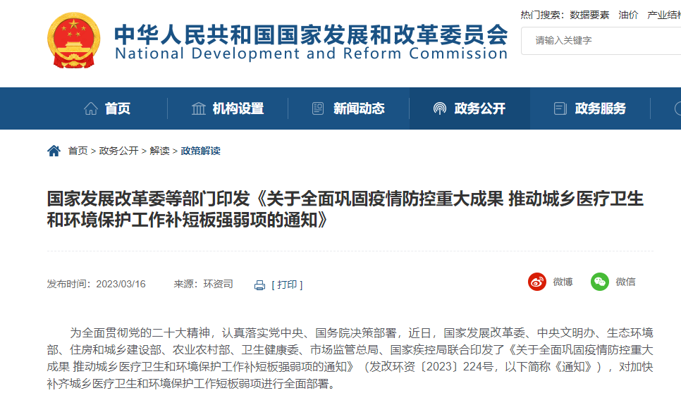 統(tǒng)籌謀劃 重點(diǎn)突破 加快補(bǔ)齊城鄉(xiāng)醫(yī)療衛(wèi)生和環(huán)境保護(hù)短板弱項 ——《關(guān)于全面鞏固疫情防控重大成果 推動城鄉(xiāng)醫(yī)療衛(wèi)生和環(huán)境保護(hù)工作補(bǔ)短板強(qiáng)弱項的通知》解讀 中國國際工程咨詢有限公司 潘小海 全面鞏固疫情防控重大成果,加強(qiáng)醫(yī)療衛(wèi)生和環(huán)境保護(hù)工作是最大程度保護(hù)人民生命安全和身體健康,最大限度減少疫情對經(jīng)濟(jì)社會發(fā)展的影響,推動經(jīng)濟(jì)平穩(wěn)健康發(fā)展的重要舉措。近日,國家發(fā)展改革委、中央文明辦、生態(tài)環(huán)境部、住房和城鄉(xiāng)建設(shè)部、農(nóng)業(yè)農(nóng)村部、國家衛(wèi)生健康委、市場監(jiān)管總局、國家疾控局聯(lián)合印發(fā)《關(guān)于全面鞏固疫情防控重大成果 推動城鄉(xiāng)醫(yī)療衛(wèi)生和環(huán)境保護(hù)工作補(bǔ)短板強(qiáng)弱項的通知》(發(fā)改環(huán)資〔2023〕224號,以下簡稱《通知》),對全面鞏固疫情防控重大成果,加快補(bǔ)齊城鄉(xiāng)醫(yī)療衛(wèi)生和環(huán)境保護(hù)短板弱項作出系統(tǒng)部署?!锻ㄖ肥锹鋵嶞h的二十大精神的具體舉措,對推動城鄉(xiāng)醫(yī)療衛(wèi)生和環(huán)境保護(hù)工作取得更大進(jìn)展,加快建設(shè)健康中國、美麗中國具有重要意義。 一、充分認(rèn)識鞏固疫情防控重大成果,加快補(bǔ)齊城鄉(xiāng)醫(yī)療衛(wèi)生和環(huán)境保護(hù)短板弱項的重要意義 (一)充分認(rèn)識這是做好新階段疫情防控的迫切需要。3年多來,以習(xí)近平同志為核心的黨中央團(tuán)結(jié)帶領(lǐng)全黨全國各族人民同心抗疫,以強(qiáng)烈的歷史擔(dān)當(dāng)和強(qiáng)大的戰(zhàn)略定力,因時因勢優(yōu)化調(diào)整防控政策措施,高效統(tǒng)籌疫情防控和經(jīng)濟(jì)社會發(fā)展,取得疫情防控重大決定性勝利。當(dāng)前全國疫情防控形勢總體向好,平穩(wěn)進(jìn)入“乙類乙管”常態(tài)化防控階段,但全球疫情仍在流行,病毒還在不斷變異,全面鞏固疫情防控重大成果,加強(qiáng)疫情監(jiān)測和常態(tài)化預(yù)警處置能力建設(shè),加強(qiáng)重點(diǎn)人群健康監(jiān)測設(shè)施和能力,抓緊補(bǔ)齊重點(diǎn)環(huán)節(jié)防控設(shè)施短板,是新階段抓實抓細(xì)疫情防控工作的具體舉措,是做好新階段疫情防控工作的迫切需要。 (二)充分認(rèn)識這是保障人民群眾生命健康的重要舉措。3年以來,在病毒猖獗時期,我國頂住了一輪又一輪疫情沖擊,成功避免了致病力較強(qiáng)、致死率較高的病毒株的廣泛流行,最大程度降低了新冠病毒感染造成的重癥率和病亡率,有效保護(hù)了人民群眾生命安全和身體健康。但同時,疫情防控中我國也暴露出重癥救治壓力大、社區(qū)醫(yī)院分流能力有待加強(qiáng)、重點(diǎn)人群及農(nóng)村地區(qū)救治任務(wù)艱巨等問題。要加快補(bǔ)齊醫(yī)療衛(wèi)生短板弱項,建強(qiáng)醫(yī)療衛(wèi)生服務(wù)網(wǎng)絡(luò)設(shè)施,強(qiáng)化醫(yī)療集團(tuán)網(wǎng)絡(luò)化布局管理機(jī)制,加強(qiáng)醫(yī)療物資資源統(tǒng)籌調(diào)配能力建設(shè),做到醫(yī)療衛(wèi)生服務(wù)資源跟得上、機(jī)制可聯(lián)動,平急結(jié)合、系統(tǒng)高效,切實維護(hù)人民群眾健康福祉。 (三)充分認(rèn)識這是共謀綠色生活共建美麗家園的重要途徑。良好生態(tài)環(huán)境是最普惠的民生福祉,是人民群眾迫切需要的公共產(chǎn)品。黨的十八大以來,以習(xí)近平同志為核心的黨中央把生態(tài)文明建設(shè)擺在全局突出位置,開展一系列根本性、開創(chuàng)性、長遠(yuǎn)性工作,我國生態(tài)環(huán)境質(zhì)量改善成效顯著,人民群眾獲得感幸福感安全感明顯增強(qiáng)。但同時,我國生態(tài)環(huán)境保護(hù)結(jié)構(gòu)性、根源性、趨勢性壓力整體尚未緩解,與人民群眾日常生活息息相關(guān)的城鄉(xiāng)環(huán)境衛(wèi)生、污水垃圾等環(huán)境基礎(chǔ)設(shè)施建設(shè)還存在短板,全社會綠色健康生活方式尚未廣泛形成。要深入開展愛國衛(wèi)生運(yùn)動,補(bǔ)齊人民群眾身邊的污水垃圾等環(huán)境基礎(chǔ)設(shè)施短板,提升全民綠色健康意識,推動共謀綠色生活共建美麗家園。 二、準(zhǔn)確把握全面鞏固疫情防控重大成果,加快補(bǔ)齊城鄉(xiāng)醫(yī)療衛(wèi)生和環(huán)境保護(hù)短板弱項的重點(diǎn)任務(wù) 《通知》堅持統(tǒng)籌推進(jìn)、重點(diǎn)突破,聚焦我國疫情防控過程中暴露出的城鄉(xiāng)醫(yī)療衛(wèi)生和環(huán)境保護(hù)工作短板弱項,以能力建設(shè)為主線,從堅決鞏固住來之不易的疫情防控重大成果、深入開展愛國衛(wèi)生運(yùn)動、加快完善環(huán)境基礎(chǔ)設(shè)施、大力倡導(dǎo)綠色健康生活方式等方面提出12項重點(diǎn)任務(wù),為城鄉(xiāng)醫(yī)療衛(wèi)生和環(huán)境保護(hù)工作補(bǔ)短板強(qiáng)弱項提供了行動指引。 (一)突出能力建設(shè)。一是在鞏固疫情防控成果方面,《通知》提出要加強(qiáng)重點(diǎn)機(jī)構(gòu)和大型場所人員的健康監(jiān)測設(shè)施和能力、醫(yī)療衛(wèi)生服務(wù)能力、醫(yī)療物資資源統(tǒng)籌調(diào)配能力以及動態(tài)監(jiān)測醫(yī)療資源使用能
