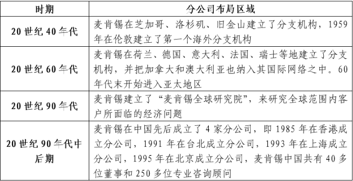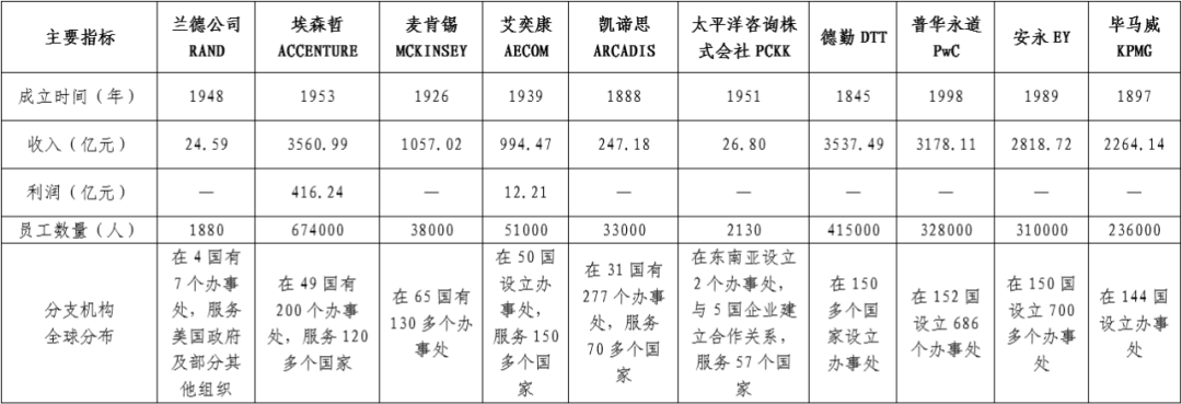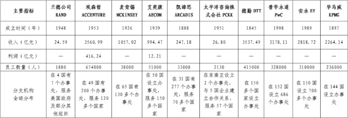 (三)研究思路 重點(diǎn)圍繞經(jīng)營(yíng)規(guī)模、全球戰(zhàn)略布局、集團(tuán)化發(fā)展、數(shù)字化發(fā)展、人才培養(yǎng)等方面開(kāi)展對(duì)比研究,為中咨公司打造世界一流咨詢機(jī)構(gòu)提出初步的方向性戰(zhàn)略構(gòu)想,更好地服務(wù)公司高質(zhì)量發(fā)展總體戰(zhàn)略。充分發(fā)揮龍頭示范作用,加強(qiáng)精細(xì)化管理,全面提升核心競(jìng)爭(zhēng)力,助力中咨公司加快建設(shè)成為國(guó)內(nèi)有權(quán)威、國(guó)際有影響的國(guó)家高端智庫(kù)、世界一流咨詢機(jī)構(gòu),體現(xiàn)智庫(kù)型中央企業(yè)的使命擔(dān)當(dāng)。 二、經(jīng)營(yíng)規(guī)模現(xiàn)狀分析 (一)對(duì)比企業(yè)經(jīng)營(yíng)規(guī)模情況 1.智庫(kù)型企業(yè) 蘭德公司(RAND)是全球頂級(jí)智庫(kù)型企業(yè)之一。蘭德公司成立于1948年,總部設(shè)在美國(guó)加利福尼亞州的圣莫尼卡,是國(guó)際最知名的非營(yíng)利性的研究機(jī)構(gòu)之一,被譽(yù)為現(xiàn)代智囊的“大腦集中營(yíng)”“超級(jí)軍事學(xué)院”,致力于以嚴(yán)謹(jǐn)?shù)姆治鲅芯縼?lái)推進(jìn)決策與政策制定。擁有來(lái)自50多個(gè)國(guó)家的1880多名員工,半數(shù)以上的研究人員持有一個(gè)或多個(gè)博士學(xué)位,在2020年全球頂級(jí)智庫(kù)綜合榜單中排名第七,2021年總收入為24.59億元(折人民幣)。 業(yè)務(wù)領(lǐng)域范圍較廣。蘭德公司資金來(lái)源廣泛,目前軍隊(duì)、政府的資助仍然超過(guò)一半以上。蘭德公司主要為美國(guó)軍方、美國(guó)政府機(jī)構(gòu)、基金會(huì)、高校以及私營(yíng)企業(yè)等提供咨詢服務(wù),研究領(lǐng)域主要涉及軍事科技、國(guó)家安全、國(guó)際事務(wù)、公共安全、法律與商業(yè)、教育、健康、基礎(chǔ)設(shè)施、交通、能源、環(huán)境、網(wǎng)絡(luò)通訊、數(shù)據(jù)科學(xué)、社會(huì)公平等。 2.管理咨詢企業(yè) 埃森哲(ACCENTURE)。埃森哲成立于1953年,是一家全球領(lǐng)先的專(zhuān)業(yè)服務(wù)公司,在數(shù)字化、云計(jì)算與網(wǎng)絡(luò)安全領(lǐng)域擁有全球領(lǐng)先的能力。埃森哲秉承“科技融靈智,匠心承未來(lái)”的企業(yè)使命,致力于通過(guò)引領(lǐng)變革創(chuàng)造價(jià)值,為客戶、員工、股東、合作伙伴與整個(gè)社會(huì)創(chuàng)造美好未來(lái)。埃森哲憑借獨(dú)特的業(yè)內(nèi)經(jīng)驗(yàn)與專(zhuān)業(yè)技能,以及翹楚全球的卓越技術(shù)中心和智能運(yùn)營(yíng)中心,為客戶提供戰(zhàn)略和咨詢、互動(dòng)體驗(yàn)、技術(shù)服務(wù)和智能運(yùn)營(yíng)等全方位服務(wù),業(yè)務(wù)涵蓋40多個(gè)行業(yè),以及企業(yè)日常運(yùn)營(yíng)部門(mén)的各個(gè)職能。埃森哲是《財(cái)富》全球500強(qiáng)企業(yè)之一,在全球49個(gè)國(guó)家設(shè)立了200多個(gè)辦事處,服務(wù)于120多個(gè)國(guó)家的客戶,擁有674000多名員工,2021年總收入為3560.99億元(折人民幣)。 麥肯錫(MCKINSEY)。麥肯錫成立于1926年,其定位是幫助領(lǐng)先的企業(yè)機(jī)構(gòu)實(shí)現(xiàn)顯著、持久的經(jīng)營(yíng)業(yè)績(jī)改善,打造能夠吸引、培育和激勵(lì)杰出人才的優(yōu)秀組織機(jī)構(gòu)。主營(yíng)業(yè)務(wù)是為客戶特別是企業(yè)設(shè)計(jì)、制定相配套的一體化解決方案,包括戰(zhàn)略開(kāi)發(fā)、經(jīng)營(yíng)運(yùn)作、組織結(jié)構(gòu)等,業(yè)務(wù)范圍涉及汽車(chē)、銀行、能源、保健、保險(xiǎn)、制造、公共事業(yè)、零售、電信和交通等領(lǐng)域。目前擁有來(lái)自80多個(gè)國(guó)家38000多名員工,2021年總收入為1057.02億元(折人民幣)。 德勤(DTT)。德勤成立于1845年,是全球領(lǐng)先的專(zhuān)業(yè)服務(wù)機(jī)構(gòu),世界四大會(huì)計(jì)師事務(wù)所之一。德勤品牌連續(xù)第四年被Brand Finance(品牌金融)評(píng)為全球最具影響力及最具價(jià)值商業(yè)服務(wù)品牌,入選全球最佳雇主榜單,為近90%的《財(cái)富》全球500強(qiáng)企業(yè)以及數(shù)千家民營(yíng)企業(yè)提供專(zhuān)業(yè)服務(wù)。德勤業(yè)務(wù)范圍包括審計(jì)和鑒證、稅務(wù)和法律、咨詢、財(cái)務(wù)咨詢和風(fēng)險(xiǎn)咨詢服務(wù)等,涉及消費(fèi)品行業(yè)、能源、資源與工業(yè)、金融服務(wù)、政府與公共服務(wù)、生命科學(xué)與醫(yī)療保健、技術(shù)、媒體與電信等領(lǐng)域。德勤在全球150多個(gè)國(guó)家設(shè)立辦事處,擁有415000多名員工,2021年總收入為3537.49億元(折人民幣)。 普華永道(PwC)。普華永道成立于1998年,是一家致力于“在社會(huì)中建立信任并解決重要問(wèn)題”的全球?qū)I(yè)服務(wù)聯(lián)盟組織。在中國(guó)注冊(cè)會(huì)計(jì)師協(xié)會(huì)《2021年度會(huì)計(jì)師事務(wù)所綜合評(píng)價(jià)百家排名信息》中,普華永道連續(xù)第十九年(2003年~2021年)蟬聯(lián)該項(xiàng)排名第一。普華永道主營(yíng)業(yè)務(wù)包括戰(zhàn)略變革,流程優(yōu)化和技術(shù)解決方案等,業(yè)務(wù)范圍涉及航空航天、國(guó)防與安全、汽車(chē)、資本項(xiàng)目和基礎(chǔ)設(shè)施、消費(fèi)市場(chǎng)、能源、公用事業(yè)和資源、工程與建筑、金融服務(wù)、政府和公