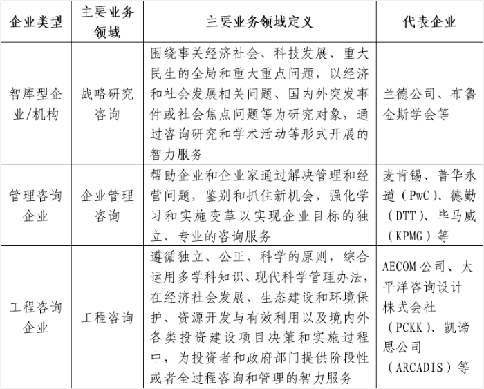 中咨公司與世界一流咨詢企業(yè)對(duì)比研究 中咨公司“青馬工程”第四小組 陳佳鵬 譚瀟 王晶晶 等 一、研究背景 (一)研究目的 黨的二十大報(bào)告提出,要“深化國(guó)資國(guó)企改革,加快國(guó)有經(jīng)濟(jì)布局優(yōu)化和結(jié)構(gòu)調(diào)整,推動(dòng)國(guó)有資本和國(guó)有企業(yè)做強(qiáng)做優(yōu)做大,提升企業(yè)核心競(jìng)爭(zhēng)力”“完善中國(guó)特色現(xiàn)代企業(yè)制度,弘揚(yáng)企業(yè)家精神,加快建設(shè)世界一流企業(yè)”,這些都為國(guó)資國(guó)企以實(shí)際行動(dòng)全面建設(shè)社會(huì)主義現(xiàn)代化國(guó)家、以中國(guó)式現(xiàn)代化推進(jìn)中華民族偉大復(fù)興提供了根本遵循。 《國(guó)企改革三年行動(dòng)方案(2020-2022年)》和《關(guān)于開(kāi)展對(duì)標(biāo)世界一流管理提升行動(dòng)的通知》(國(guó)資發(fā)改革〔2020〕39號(hào)),要求中央企業(yè)要對(duì)標(biāo)世界一流企業(yè),通過(guò)管理提升,建設(shè)成為具有全球競(jìng)爭(zhēng)力的企業(yè)。中國(guó)國(guó)際工程咨詢有限公司(以下簡(jiǎn)稱(chēng)中咨公司)“十四五”規(guī)劃明確提出,未來(lái)發(fā)展要聚焦于實(shí)現(xiàn)建成國(guó)家高端智庫(kù)和世界一流咨詢機(jī)構(gòu)的戰(zhàn)略目標(biāo),指明了公司的前進(jìn)方向。 為深入貫徹黨的二十大報(bào)告關(guān)于國(guó)資國(guó)企改革發(fā)展和黨的建設(shè)的重大部署,認(rèn)真落實(shí)國(guó)務(wù)院國(guó)資委關(guān)于中央企業(yè)對(duì)標(biāo)世界一流管理提升改革行動(dòng)計(jì)劃的相關(guān)部署和中咨公司“十四五”發(fā)展規(guī)劃,以推動(dòng)公司高質(zhì)量發(fā)展為主題,以改革創(chuàng)新為根本動(dòng)力,緊扣“加快建設(shè)世界一流咨詢機(jī)構(gòu)”目標(biāo),通過(guò)選取咨詢領(lǐng)域有較強(qiáng)影響力的標(biāo)桿企業(yè)開(kāi)展對(duì)比研究,提出中咨公司建設(shè)世界一流咨詢機(jī)構(gòu)的戰(zhàn)略構(gòu)想,進(jìn)一步搶抓高質(zhì)量發(fā)展的重要戰(zhàn)略機(jī)遇期。 (二)對(duì)比范圍 基于中咨公司業(yè)務(wù)范圍與自身戰(zhàn)略規(guī)劃,本次研究將重點(diǎn)選取全球領(lǐng)先的智庫(kù)型企業(yè)、管理咨詢企業(yè)、工程咨詢企業(yè)進(jìn)行對(duì)比研究。 表1 三類(lèi)咨詢企業(yè)分類(lèi)一覽表