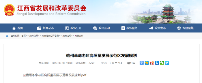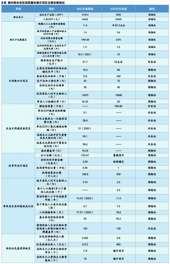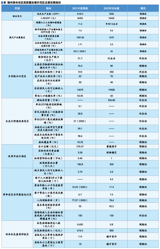 探索革命老區(qū)振興發(fā)展新路徑 ——《贛州革命老區(qū)高質(zhì)量發(fā)展示范區(qū)發(fā)展規(guī)劃》解讀 田煜 董繼紅 贛州革命老區(qū)是土地革命戰(zhàn)爭(zhēng)時(shí)期中央蘇區(qū)的主體和核心區(qū)域,中華蘇維埃共和國(guó)在此奠基,中央紅軍氣壯山河的二萬(wàn)五千里長(zhǎng)征從瑞金、于都等地出發(fā),艱苦卓絕的南方三年游擊戰(zhàn)爭(zhēng)在贛南山區(qū)浴血堅(jiān)持,以毛澤東同志為代表的老一輩無(wú)產(chǎn)階級(jí)革命家在這里留下閃光足跡。黨中央高度關(guān)注贛州革命老區(qū)振興發(fā)展,在習(xí)近平總書(shū)記的親自關(guān)心和推動(dòng)下,2012年6月,國(guó)務(wù)院出臺(tái)《關(guān)于支持贛南等原中央蘇區(qū)振興發(fā)展的若干意見(jiàn)》,開(kāi)啟了贛南蘇區(qū)振興發(fā)展的嶄新篇章。 2021年1月,國(guó)務(wù)院出臺(tái)《關(guān)于新時(shí)代支持革命老區(qū)振興發(fā)展的意見(jiàn)》,提出研究支持贛州、三明等城市建設(shè)革命老區(qū)高質(zhì)量發(fā)展示范區(qū)。2022年3月,國(guó)務(wù)院批復(fù)同意《贛州革命老區(qū)高質(zhì)量發(fā)展示范區(qū)建設(shè)方案》。近期,經(jīng)江西省人民政府同意,《贛州革命老區(qū)高質(zhì)量發(fā)展示范區(qū)發(fā)展規(guī)劃》(以下簡(jiǎn)稱《規(guī)劃》)正式印發(fā)?!兑?guī)劃》明確了示范區(qū)建設(shè)的戰(zhàn)略目標(biāo)、重點(diǎn)任務(wù)和支持政策,為贛州在全國(guó)革命老區(qū)高質(zhì)量發(fā)展上作示范、勇?tīng)?zhēng)先繪就了“路線圖”“施工圖”。 01 《規(guī)劃》為贛南蘇區(qū)振興發(fā)展指明了新發(fā)展階段的行動(dòng)目標(biāo) 黨的十八大以來(lái),在黨中央堅(jiān)強(qiáng)領(lǐng)導(dǎo)和關(guān)心關(guān)懷下,在中央國(guó)家機(jī)關(guān)及有關(guān)單位的鼎力支持下,贛州經(jīng)濟(jì)社會(huì)發(fā)展取得歷史性成就。經(jīng)過(guò)十年振興發(fā)展,經(jīng)濟(jì)實(shí)力大步跨越,2012-2021年,贛州市地區(qū)生產(chǎn)總值從1700億元增至3658億元,年均增速9.2%,高于同期全國(guó)、全省水平2.5、0.5個(gè)百分點(diǎn),人均GDP與全國(guó)平均水平的差距縮小了10.8個(gè)百分點(diǎn);特色產(chǎn)業(yè)揚(yáng)優(yōu)成勢(shì),營(yíng)商環(huán)境持續(xù)優(yōu)化,2022年,實(shí)際利用外資3.73億美元、進(jìn)出口總額1033.1億元,在全國(guó)革命老區(qū)重點(diǎn)城市中位居前列。生態(tài)屏障持續(xù)筑牢,水土保持生態(tài)治理“贛州模式”、山水林田湖草沙綜合治理“尋烏經(jīng)驗(yàn)”在全國(guó)推廣。贛州人民堅(jiān)定執(zhí)著聽(tīng)黨話、感黨恩、跟黨走,紅色基因薪火相傳,煥發(fā)新的時(shí)代榮光。 立足新階段,《規(guī)劃》錨定2035年與全國(guó)同步基本實(shí)現(xiàn)社會(huì)主義現(xiàn)代化的遠(yuǎn)景目標(biāo),綜合考慮贛州市發(fā)展條件和外部環(huán)境,緊密銜接“十四五”規(guī)劃綱要及各領(lǐng)域?qū)m?xiàng)規(guī)劃,在綜合實(shí)力、產(chǎn)業(yè)發(fā)展、鄉(xiāng)村振興、生態(tài)文明、改革開(kāi)放、共同富裕、紅色傳承7個(gè)方面設(shè)置了36項(xiàng)主要指標(biāo)。指標(biāo)選取緊扣“6個(gè)區(qū)”戰(zhàn)略定位和“十四五”階段性任務(wù),突出代表性,同時(shí)有利于考核監(jiān)測(cè)任務(wù)的落實(shí)情況。在確定經(jīng)濟(jì)增長(zhǎng)目標(biāo)時(shí),《規(guī)劃》對(duì)標(biāo)“十四五”規(guī)劃綱要,同時(shí)結(jié)合2020-2022年贛州市實(shí)際經(jīng)濟(jì)增長(zhǎng)情況,提出了到2025年GDP突破5500億元的預(yù)期目標(biāo)。在設(shè)置反映產(chǎn)業(yè)發(fā)展的相關(guān)指標(biāo)時(shí),《規(guī)劃》充分對(duì)接經(jīng)濟(jì)高質(zhì)量發(fā)展內(nèi)涵,納入數(shù)字經(jīng)濟(jì)、科技創(chuàng)新等反映質(zhì)量效益的指標(biāo),體現(xiàn)了贛州革命老區(qū)堅(jiān)定不移強(qiáng)化科技創(chuàng)新,著力提升產(chǎn)業(yè)層次的勇氣和決心。 資料來(lái)源:《贛州革命老區(qū)高質(zhì)量發(fā)展示范區(qū)發(fā)展規(guī)劃》 02 《規(guī)劃》聚焦新發(fā)展理念因地制宜謀劃了作示范的六大領(lǐng)域 立足新起點(diǎn),奮進(jìn)新征程,贛州堅(jiān)持在推進(jìn)中國(guó)式現(xiàn)代化的偉大進(jìn)程中,探索革命老區(qū)振興發(fā)展新路徑?!兑?guī)劃》圍繞“六個(gè)作示范”領(lǐng)域,細(xì)化、實(shí)化了構(gòu)建現(xiàn)代產(chǎn)業(yè)體系、全面推進(jìn)鄉(xiāng)村振興、建設(shè)美麗中國(guó)“贛州樣板”、堅(jiān)持深化改革開(kāi)放、健全公共服務(wù)體系、賡續(xù)紅色血脈六個(gè)方面的重點(diǎn)任務(wù)。 (一)構(gòu)建現(xiàn)代產(chǎn)業(yè)體系,推進(jìn)產(chǎn)業(yè)創(chuàng)新發(fā)展先行示范。習(xí)近平總書(shū)記指出,要堅(jiān)持面向世界科技前沿、面向經(jīng)濟(jì)主戰(zhàn)場(chǎng)、面向國(guó)家重大需求、面向人民生命健康,加快實(shí)現(xiàn)高水平科技自立自強(qiáng)。近年來(lái),贛州革命老區(qū)堅(jiān)定不移走集群發(fā)展、創(chuàng)新發(fā)展、融合發(fā)展道路,加快培育特色優(yōu)勢(shì)產(chǎn)業(yè)集群,現(xiàn)代家居產(chǎn)業(yè)從百億“草根經(jīng