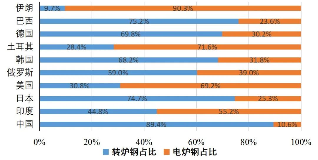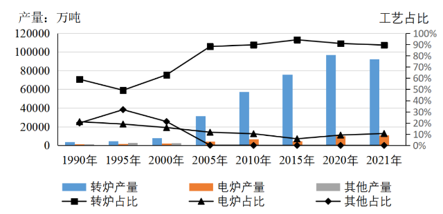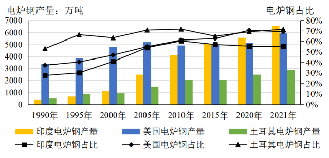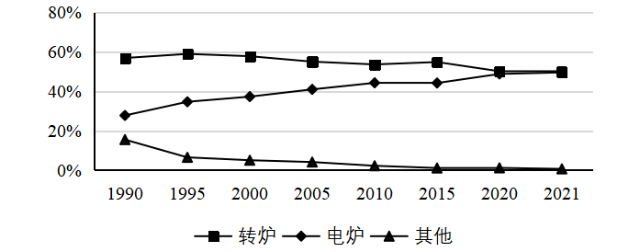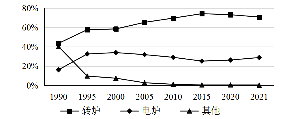 摘要:全球粗鋼產(chǎn)量中,長流程工藝占70%。主要產(chǎn)鋼國中,中國、日本、俄羅斯、韓國、德國以轉(zhuǎn)爐鋼為主,印度、美國、土耳其以電爐鋼為主。我國電爐鋼產(chǎn)量超過1億噸,占全球的近20%,但不同于美國、土耳其等國家,廢鋼在我國電爐鋼原料中的占比不足50%,其余為鐵水或鐵塊。未來一段時期,我國粗鋼產(chǎn)量將處于較高水平,雖然電爐鋼產(chǎn)量呈增長趨勢,但轉(zhuǎn)爐鋼仍占據(jù)優(yōu)勢地位。建議加強廢鋼資源回收利用、避免電爐工藝“大躍進”、增加轉(zhuǎn)爐廢鋼使用量。 關(guān)鍵詞:鋼鐵;工藝結(jié)構(gòu);轉(zhuǎn)爐鋼;電爐鋼 鋼鐵生產(chǎn)工藝主要有2種,即以鐵礦石為主要原料的高爐-轉(zhuǎn)爐長流程工藝和以廢鋼為主要原料的電爐短流程工藝。長期以來,憑借原料易獲得等優(yōu)勢,長流程工藝始終占據(jù)主導(dǎo)地位。短流程工藝工序少、投資小、能耗低、排放少,在廢鋼資源豐富、電價較低的地區(qū)具有更好的發(fā)展優(yōu)勢,未來發(fā)展空間較大。分析國內(nèi)外鋼鐵生產(chǎn)工藝結(jié)構(gòu)變化情況,對研究我國鋼鐵工業(yè)生產(chǎn)工藝發(fā)展方向具有重要意義。 一、全球鋼鐵生產(chǎn)工藝結(jié)構(gòu) 1.長流程始終占主導(dǎo)地位,短流程基本保持在30%左右 自1990年以來,轉(zhuǎn)爐鋼占全球鋼產(chǎn)量的比重從57%左右增長到70%左右,始終占據(jù)主導(dǎo)地位。電爐鋼產(chǎn)量占比從27%增長到2000年的34%,之后降至29%,基本保持在30%左右。以平爐裝備為代表的其他工藝鋼產(chǎn)量占比從16%持續(xù)下降至不足0.5%。1990年以來全球粗鋼生產(chǎn)工藝結(jié)構(gòu)見圖1。 數(shù)據(jù)來源:世界鋼鐵協(xié)會。 圖1 1990年以來全球粗鋼生產(chǎn)工藝結(jié)構(gòu) 2.世界主要產(chǎn)鋼國中,長流程鋼產(chǎn)量占絕對優(yōu)勢 2021年,世界鋼產(chǎn)量超過5000萬噸的國家有6個,其中中國、日本、俄羅斯、韓國均以轉(zhuǎn)爐鋼為主,僅印度、美國以電爐鋼為主。全球前十大產(chǎn)鋼國2021年鋼產(chǎn)量16.23億噸。其中,轉(zhuǎn)爐鋼產(chǎn)量12.35億噸,占76.1%;電爐鋼產(chǎn)量3.86億噸,占23.8%;其他工藝鋼產(chǎn)量0.02億噸,占0.1%。2021年全球前十大產(chǎn)鋼國工藝結(jié)構(gòu)見圖2。 數(shù)據(jù)來源:世界鋼鐵協(xié)會。 圖2 2021年全球前十大產(chǎn)鋼國工藝結(jié)構(gòu) 3.中國鋼產(chǎn)量大幅增長,對全球鋼鐵生產(chǎn)工藝結(jié)構(gòu)影響巨大 2000年-2021年,以長流程為主的中國鋼產(chǎn)量大幅增長,是全球電爐鋼產(chǎn)量占比下降的主要原因。中國鋼產(chǎn)量從1.3億噸快速增長至10.3億噸,占全球鋼產(chǎn)量的比重從15%提高至53%。中國鋼產(chǎn)量中,轉(zhuǎn)爐鋼占絕大部分,從2000年的0.8億噸增長至2021年的9.2億噸,占全球總產(chǎn)量的比重從不足10%增加到50%左右。2020年以來中 國鋼產(chǎn)量占全球鋼產(chǎn)量比重見圖3。 數(shù)據(jù)來源:世界鋼鐵協(xié)會。 圖3 2000年以來中國鋼產(chǎn)量占全球鋼產(chǎn)量比重 4.中國以外地區(qū)電爐鋼產(chǎn)量占比明顯增加,接近50% 1990年-2021年,中國以外地區(qū)鋼產(chǎn)量呈增長趨勢,從6.81億噸增長到9.17億噸,增幅34.7%。其中,轉(zhuǎn)爐鋼產(chǎn)量從3.87億噸增長到4.57億噸,增幅18.1%;電爐鋼產(chǎn)量從1.89億噸增長到4.54億噸,增幅140.2%;其他工藝鋼產(chǎn)量從1.05億噸減少到585萬噸,占比不足1%。電爐鋼產(chǎn)量占比從27.7%顯著提升至49.5%。1990年以來中國以外地區(qū)粗鋼生產(chǎn)工藝結(jié)構(gòu)見圖4。 數(shù)據(jù)來源:世界鋼鐵協(xié)會。 圖4 1990年以來中國以外地區(qū)粗鋼生產(chǎn)工藝結(jié)構(gòu) 二、 主要產(chǎn)鋼國生產(chǎn)工藝結(jié)構(gòu) 1.印度、美國、土耳其形成了以電爐鋼為主的工藝結(jié)構(gòu) 印度、美國、土耳其等國依托自身資源條件,逐步形成了以電爐鋼為主的工藝結(jié)構(gòu)(見圖5)。1990年-2021年,印度電爐鋼產(chǎn)量從411萬噸增長到6525萬噸,增加6084萬噸,增長14.9倍;美國電爐鋼產(chǎn)量從3351萬噸增長到5937萬噸,增加2586萬噸,增幅77.2%;土耳其電爐鋼產(chǎn)量從496萬噸增長到2893萬噸,增加2397萬噸,增長4.8倍。2021年,印度、美國、土耳其電爐鋼占比分別為55.2%、69.2%、71.6%。 數(shù)據(jù)來源:世界鋼鐵協(xié)會。 圖5 印度、美國、土耳其電爐鋼產(chǎn)量及占比 2.日本、俄羅斯、韓國、德國保持以轉(zhuǎn)爐鋼為主的工藝結(jié)構(gòu) 1990年-2021年,日本轉(zhuǎn)爐鋼、電爐鋼產(chǎn)量分別從7564萬噸、3470萬噸降至7194萬噸、2436萬噸,降幅分別為4.9%、29.8%。俄羅斯轉(zhuǎn)爐鋼產(chǎn)量從5437萬噸降至4460萬噸,降幅為18.0%;電爐鋼產(chǎn)量從2013萬噸增至2948萬噸,增幅為46.4%;平爐鋼產(chǎn)量從7985萬噸降至151萬噸,降幅為98.1%。德國轉(zhuǎn)爐鋼產(chǎn)量從3324萬噸降至2799萬噸,降幅為15.8%;電爐鋼產(chǎn)量從886萬噸增至1211萬噸,增幅為36.7%。韓國轉(zhuǎn)爐鋼、電爐鋼產(chǎn)量分別從1594萬噸、719萬噸增至4801萬噸、2239萬噸,增幅分別為201.2%、211.4%。除日本外,俄羅斯、韓國、德國電爐鋼產(chǎn)量均有較大幅度增長,但仍以轉(zhuǎn)爐鋼為主。2021年,日本、俄羅斯、韓國、德國轉(zhuǎn)爐鋼占比分別為74.7%、59.0%、68.2%、69.8%。日本、俄羅斯、韓國、德國轉(zhuǎn)爐鋼占比情況見圖6。 數(shù)據(jù)來源:世界鋼鐵協(x