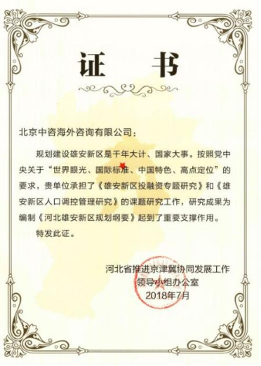 雄安新區(qū)位于北京、天津、保定之間,是連接京津冀的重要樞紐,也是推進高質量發(fā)展的全國樣板。設立河北雄安新區(qū),是以習近平同志為核心的黨中央深入推進京津冀協(xié)同發(fā)展作出的一項重大決策部署,是千年大計、國家大事?!熬┙蚣饺缤欢浠ㄉ系幕ò?,瓣瓣不同,卻瓣瓣同心。”習近平總書記的話情真意切,寓意深長。服務雄安地區(qū)高質量發(fā)展是中咨公司的職責所在、優(yōu)勢所在,更是中咨公司服務國家戰(zhàn)略、踐行智庫使命的初心所在。 雄安新區(qū)的建設,需要緊緊圍繞“人”這個核心謀篇布局,牢牢抓住“錢”這個支撐要素。2017年5月,受河北省推進京津冀協(xié)同發(fā)展領導小組辦公室委托,中咨海外公司承擔了《雄安新區(qū)人口調控管理研究》《雄安新區(qū)投融資研究》2項課題研究工作。在時任中咨海外公司副總經(jīng)理徐小元領導和組織下,中咨海外公司迅速成立覆蓋多學科、跨部門的專業(yè)研究團隊,專題開展雄安新區(qū)人口調控管理和投融資研究工作。 人口調控管理項目團隊首先面臨的難題是雄安新區(qū)人口規(guī)模預測無據(jù)可依、無從下手。雄安新區(qū)的定位與傳統(tǒng)城市存在較大差異,若采取自然增長率數(shù)學模型對人口規(guī)模進行測算,難以適應雄安新區(qū)“未來之城”建設需求,最終影響課題研究成果科學性和合理性。為此,項目團隊集中辦公,日夜奮戰(zhàn),歷時半年,終于建立了“需求+約束”人口規(guī)模預測模型,科學解決了雄安新區(qū)人口規(guī)模預測的難題;同時,對雄安新區(qū)人口調控提出階段性安排措施,既體現(xiàn)人口全過程調控的思想,又體現(xiàn)堅持行政推動和市場引導相結合的原則;創(chuàng)新人口調控管理機制,為雄安新區(qū)人口科學管理提供切實可行的政策依據(jù)。 雄安新區(qū)投融資研究團隊面對復雜的投資建設需求,從深入開展調查研究起步,收集大量政府投資項目綜合指標數(shù)據(jù)、項目庫積累的類似項目資料以及相關城市建設投資指標經(jīng)驗值。本著高標準高質量的建設要求,遵循城市規(guī)劃建設規(guī)律,按照區(qū)域空間、資金來源、建設時序等諸多因素,將新區(qū)建設內(nèi)容及規(guī)模設計成網(wǎng)絡模型,以資金需求總盤子為目標,以建設標準、造價水平為基礎依據(jù),立足新區(qū)定位,疊加國內(nèi)外先進經(jīng)驗,最終建立新區(qū)投資需求測算模型,形成12大板塊54個子項的測算體系。同時,項目團隊在設計資金平衡方案過程中,總體理念實現(xiàn)從建設期資金平衡到城市發(fā)展總體平衡的轉變,充分考慮城市發(fā)展的代際、階段、行業(yè)等因素,為新區(qū)未來財稅創(chuàng)新留出空間。 有志者事竟成。中咨海外公司交出了一份滿意答卷,獲得河北省委省政府的充分肯定,為《河北雄安新區(qū)規(guī)劃綱要》(2018年4月14日中共中央、國務院批復)的編制起到重要支撐作用,加快推動新區(qū)投融資政策創(chuàng)新集成,建立新區(qū)長期穩(wěn)定的資金籌措機制,整體提高新區(qū)資金統(tǒng)籌能力,為雄安新區(qū)未來發(fā)展作出重要貢獻。研究成果獲得“中咨公司優(yōu)秀咨詢成果三等獎”及“全國優(yōu)秀工程咨詢成果一等獎”。