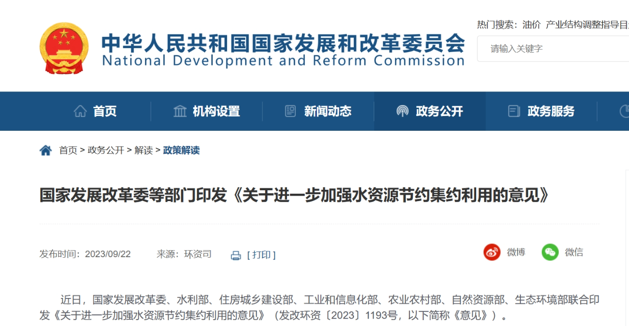 落實(shí)全面節(jié)約 堅(jiān)持四水四定 進(jìn)一步加強(qiáng)水資源節(jié)約集約利用 ——《關(guān)于進(jìn)一步加強(qiáng)水資源節(jié)約集約利用的意見》專家解讀 加強(qiáng)水資源節(jié)約集約利用,推動(dòng)全過程、全領(lǐng)域、全社會(huì)節(jié)水,是深入貫徹習(xí)近平生態(tài)文明思想、實(shí)施全面節(jié)約戰(zhàn)略的重要舉措,是緩解我國(guó)水資源供需矛盾、保障水安全的必然選擇。近日,國(guó)家發(fā)展改革委、水利部、住房城鄉(xiāng)建設(shè)部、工業(yè)和信息化部、農(nóng)業(yè)農(nóng)村部、自然資源部、生態(tài)環(huán)境部等部門聯(lián)合印發(fā)《關(guān)于進(jìn)一步加強(qiáng)水資源節(jié)約集約利用的意見》(發(fā)改環(huán)資〔2023〕1193號(hào),以下簡(jiǎn)稱《意見》),強(qiáng)化“四水四定”,對(duì)推進(jìn)水資源總量管理、科學(xué)配置、全面節(jié)約、循環(huán)利用,深入實(shí)施國(guó)家節(jié)水行動(dòng)作出了新的部署,凸顯以下四大亮點(diǎn)。 01. 強(qiáng)調(diào)配取用排節(jié)水,強(qiáng)化全過程水資源節(jié)約 《意見》提出,在配置階段,加強(qiáng)用水總量和強(qiáng)度雙控,加快開展跨行政區(qū)江河流域水量分配,堅(jiān)持先節(jié)水后調(diào)水,把節(jié)水作為受水區(qū)的根本出路;在取水階段,嚴(yán)格建設(shè)項(xiàng)目水資源論證,依法審批取水許可,整治違法取水問題;在用水階段,健全用水定額體系,做好用水定額動(dòng)態(tài)評(píng)估和更新,落實(shí)計(jì)劃用水,提高各領(lǐng)域用水效率;在回用階段,推行非常規(guī)水源納入水資源統(tǒng)一配置,缺水城市積極拓展再生水利用領(lǐng)域和規(guī)模,具備條件的地方充分利用海水、礦井水、雨水等非常規(guī)水源。水資源節(jié)約集約利用工作貫穿全生命周期,涵蓋了資源配置階段的科學(xué)性、利用過程的先進(jìn)性以及回用環(huán)節(jié)的可行性,旨在推行全過程管理和全鏈條節(jié)約。 02. 創(chuàng)新性提出生態(tài)景觀節(jié)水,強(qiáng)化全領(lǐng)域水資源節(jié)約 近年來,我國(guó)用水結(jié)構(gòu)不斷優(yōu)化,生態(tài)用水在用水總量中占比逐年增加,目前已超過居民生活用水的一半,因此生態(tài)景觀節(jié)水的重要性不可忽視。此外,隨著城市建設(shè)步伐的加快,城市景觀綠化面積迅速擴(kuò)大,不恰當(dāng)?shù)木G化植被和人工水景消耗了大量的水資源?!兑庖姟穼⑸鷳B(tài)景觀節(jié)水與農(nóng)業(yè)農(nóng)村、工業(yè)、城鎮(zhèn)三大傳統(tǒng)用水領(lǐng)域并列,補(bǔ)上了全領(lǐng)域節(jié)水的最后一塊拼圖,提出要堅(jiān)持以水定綠,堅(jiān)持山水林田湖草沙一體化保護(hù)和系統(tǒng)治理,統(tǒng)籌推進(jìn)水源涵養(yǎng)、國(guó)土綠化、防沙治沙、濕地修復(fù)、水土保持;嚴(yán)控景觀用水,嚴(yán)禁違背自然規(guī)律挖湖造景,限制盲目擴(kuò)大景觀和娛樂場(chǎng)地的水域面積,黃河流域嚴(yán)控新建親水公園。 03. 關(guān)注節(jié)水產(chǎn)業(yè),明確節(jié)水增效雙提升新抓手 發(fā)展節(jié)水產(chǎn)業(yè)經(jīng)濟(jì)新業(yè)態(tài),協(xié)調(diào)推進(jìn)“產(chǎn)業(yè)節(jié)水”與“節(jié)水產(chǎn)業(yè)”協(xié)同發(fā)展,是推動(dòng)水資源高效利用與產(chǎn)業(yè)質(zhì)量效益共同提升的有力抓手。我國(guó)一直把發(fā)展節(jié)水產(chǎn)業(yè)放在重要位置,《國(guó)家節(jié)水行動(dòng)方案》中多次強(qiáng)調(diào)加快成果轉(zhuǎn)化和產(chǎn)業(yè)培育,《意見》專門成章并提出細(xì)化措施支持節(jié)水產(chǎn)業(yè)發(fā)展壯大,如加強(qiáng)技術(shù)研發(fā)應(yīng)用,支持舉辦節(jié)水創(chuàng)新發(fā)展大會(huì)及高新技術(shù)成果展,推進(jìn)技術(shù)產(chǎn)業(yè)化;推廣節(jié)水產(chǎn)品,實(shí)施水效標(biāo)識(shí),推行綠色產(chǎn)品政府采購(gòu),依法打擊水效虛標(biāo),推進(jìn)節(jié)水信息化管理;推動(dòng)節(jié)水服務(wù)產(chǎn)業(yè)發(fā)展,積極開展用水權(quán)交易,落實(shí)交易收益分配制度,在公共機(jī)構(gòu)、高耗水行業(yè)、供水管網(wǎng)漏損控制等領(lǐng)域推廣合同節(jié)水管理。 04. 突出問題導(dǎo)向,聚焦短板弱項(xiàng)破解難點(diǎn)堵點(diǎn) 《意見》秉持問題導(dǎo)向,聚焦亟待解決的難點(diǎn)堵點(diǎn),緊盯細(xì)分領(lǐng)域、重點(diǎn)區(qū)域和短板弱項(xiàng),有針對(duì)性地提出了應(yīng)對(duì)舉措。如我國(guó)在農(nóng)業(yè)節(jié)水方面已有高效節(jié)水灌溉技術(shù)、農(nóng)田水利工程等有力措施,但農(nóng)業(yè)用水計(jì)量與監(jiān)測(cè)設(shè)施建設(shè)仍是薄弱環(huán)節(jié),《意見》提出,5萬畝以上大中型灌區(qū)渠首取水口要實(shí)現(xiàn)在線計(jì)量,大中型灌區(qū)應(yīng)在產(chǎn)權(quán)分界點(diǎn)安裝計(jì)量設(shè)施,高標(biāo)準(zhǔn)農(nóng)田和高效節(jié)水灌溉項(xiàng)目要配套實(shí)用易行的計(jì)量設(shè)施,進(jìn)一步細(xì)化計(jì)量單元。又如,公共機(jī)構(gòu)是用水大戶,也是節(jié)水示范引領(lǐng)的重要載體,近來會(huì)議場(chǎng)所“半瓶水”浪費(fèi)現(xiàn)象備受關(guān)注,《意見》對(duì)此提出,公共機(jī)構(gòu)