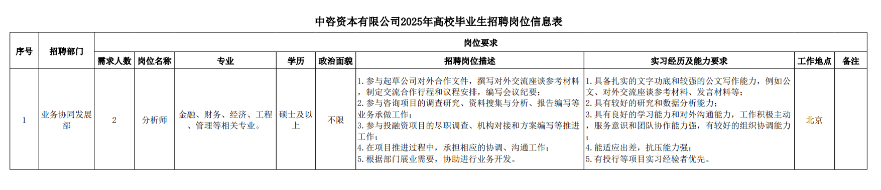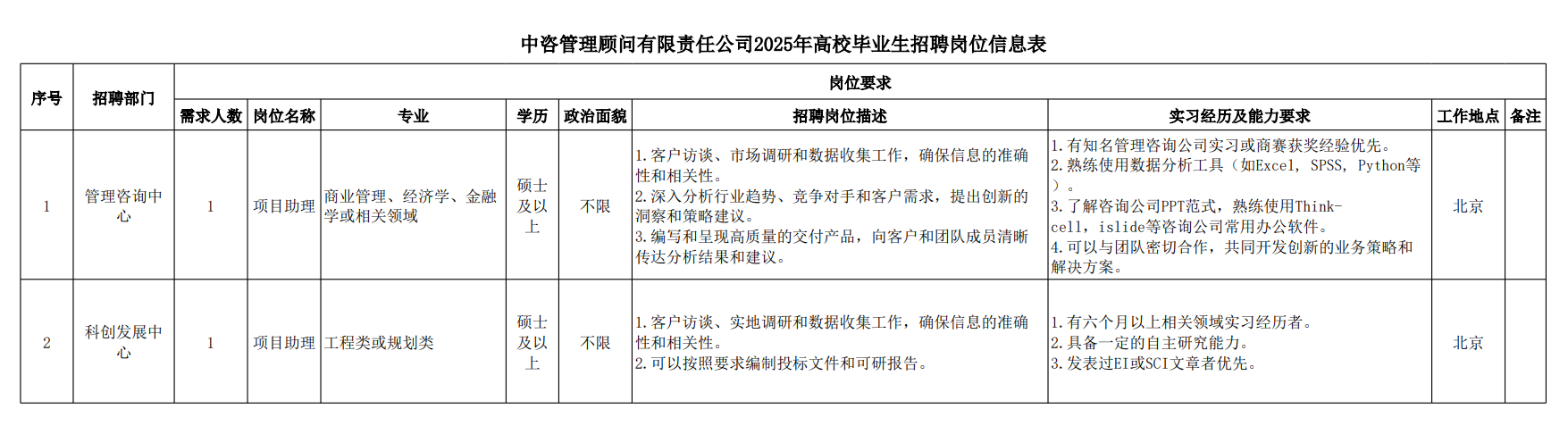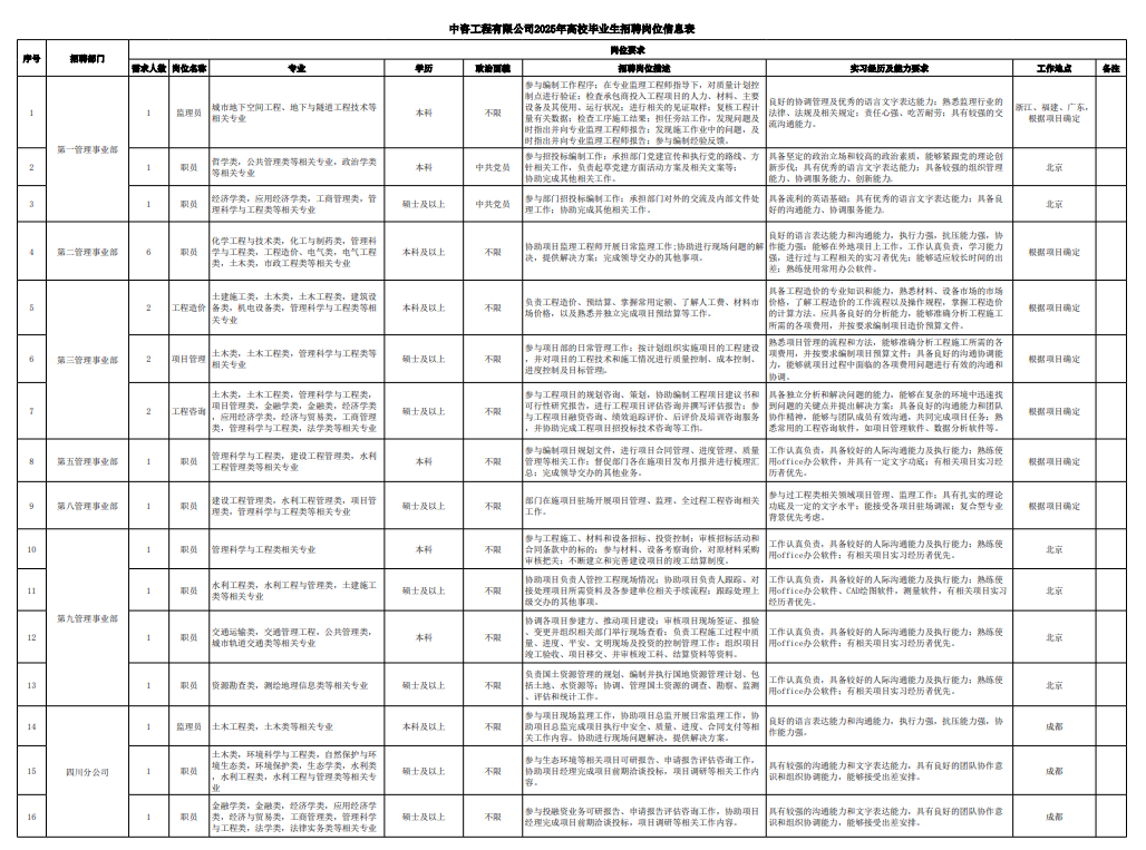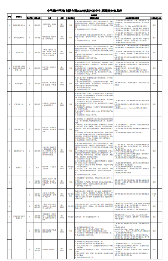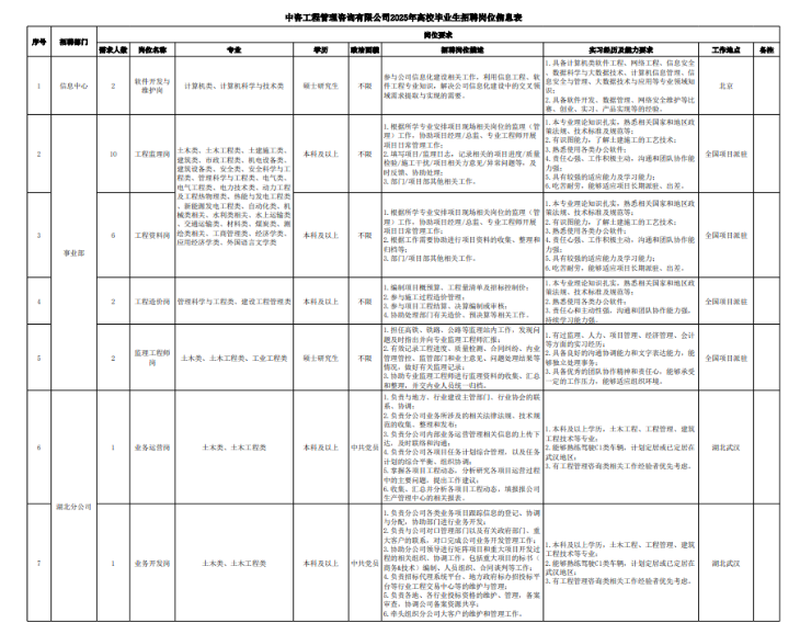 中咨工程管理咨詢有限公司 一、公司簡介 中咨工程管理咨詢有限公司(簡稱“中咨管理”)成立于1989年,是中國國際工程咨詢有限公司(簡稱“中咨公司”)的子公司,注冊資金1.55億元?,F(xiàn)有員工4100余人,各項資質(zhì)證書持證2600余冊,中高級職稱比例超50%。 中咨管理公司是國內(nèi)從事工程管理類業(yè)務(wù)最早、規(guī)模最大、行業(yè)最廣、業(yè)績最多的企業(yè)之一,具有工程咨詢甲級資信、工程監(jiān)理綜合資質(zhì)以及設(shè)備、公路工程、地質(zhì)災(zāi)害防治工程、人民防空工程等多項專業(yè)監(jiān)理甲級資質(zhì),并列入政府采購招標(biāo)代理機(jī)構(gòu)和中央投資項目招標(biāo)代理機(jī)構(gòu)名單。業(yè)務(wù)涵蓋工程前期咨詢、項目管理、項目代建、招標(biāo)代理、造價咨詢、工程監(jiān)理、設(shè)備監(jiān)理、設(shè)計優(yōu)化、工程質(zhì)量安全評估咨詢等項目全過程咨詢服務(wù),涉及房屋建筑、交通、石化、水利、電力、冶煉、礦山、市政、生態(tài)環(huán)境、通信和信息化等多個行業(yè)。業(yè)務(wù)遍布全國及全球近50個國家和地區(qū),累計服務(wù)各類咨詢管理項目超過1萬個,涉及工程建設(shè)投資近5萬億元。曾榮獲56項中國建設(shè)工程魯班獎、15項中國土木工程詹天佑獎、64項國家優(yōu)質(zhì)工程獎、23項中國鋼結(jié)構(gòu)金獎以及各類省級或行業(yè)獎項500余項。 經(jīng)過30余年的不懈努力,我們積累了豐富的工程管理經(jīng)驗,為各類工程建設(shè)項目保駕護(hù)航,“中咨管理”品牌成為行業(yè)的一面旗幟。我們崇尚簡單、包容、共享的哲學(xué)理念,秉持創(chuàng)造價值、貢獻(xiàn)社會的使命和專業(yè)創(chuàng)造精品、價值成就客戶的核心價值觀,為成為全過程工程管理咨詢的領(lǐng)先者而奮斗。優(yōu)秀的你值得更好的平臺,加入我們,攜手共創(chuàng)新篇章! 二、應(yīng)聘條件 (一)2025年全日制本科及以上應(yīng)屆畢業(yè)生; (二)年齡要求:本科生24周歲及以下(2001年1月1日后出生),碩士研究生27周歲及以下(1998年1月1日后出生); (三)在校就讀期間無在職工作經(jīng)歷,無社保繳納記錄和派遣落戶記錄; (四)成績優(yōu)秀,人品端正,積極進(jìn)取,愿與公司共改革、奮進(jìn); (五)具備扎實的專業(yè)理論知識和良好的溝通能力,實踐能力較強(qiáng); (六)熟練使用各類辦公軟件; (七)簡歷需注明出生日期、生源地(即入學(xué)前戶籍所在地)。 三、應(yīng)聘程序 發(fā)布招聘公告→簡歷投遞→簡歷篩選→筆試→面試→確定人選并公示→發(fā)放錄用通知。 四、招聘崗位信息 五、報名方式 本次招聘報名采取在線填報方式進(jìn)行:應(yīng)聘者請使用Chrome內(nèi)核瀏覽器(如:Chrome瀏覽器、360瀏覽器、百度瀏覽器、搜狗瀏覽器、UC瀏覽器等)登錄網(wǎng)站報名,網(wǎng)站鏈接:https://hcmcloud.ciecc.com.cn/recruit/#/index 或使用手機(jī)掃描二維碼: 中咨工程有限公司 一、公司簡介 中咨工程有限公司是中咨公司的控股子公司。公司由中咨公司和中國廣核電力股份有限公司合資成立,于2010 年12 月完成正式注冊,注冊資本金為8000 萬元人民幣。 公司作為中咨公司工程管理業(yè)務(wù)板塊的成員,主營業(yè)務(wù)為全過程工程管理(咨詢)服務(wù)業(yè)務(wù),包括全過程中的各節(jié)點業(yè)務(wù)(1+X),業(yè)務(wù)范圍涉及石化、核電、冶金、交通和民用市政等多個領(lǐng)域行業(yè)工程項目的前期咨詢及咨詢管理、勘察管理、設(shè)計管理、監(jiān)理、采購管理、造價咨詢、建造過程管理、項目管理(IPMT、PMC等)、項目代建和技術(shù)服務(wù)等。 在新時代、新征程、新階段,公司將繼續(xù)以為國家、社會和股東創(chuàng)造價值為己任,以“139”戰(zhàn)略規(guī)劃為引領(lǐng),以高質(zhì)量發(fā)展為目標(biāo),通過積極參與市場競爭,培育增強(qiáng)公司核心競爭能力,矢志發(fā)展成為具備承接大中型全過程工程管理(咨詢)服務(wù)業(yè)務(wù)能力的、具有國際競爭力的工程公司。 二、應(yīng)聘條件 (一)2025年全日制本科及以上應(yīng)屆畢業(yè)生(部分崗位碩士及以上學(xué)歷),滿足人社部落戶條件,在校就讀期間無在職工作經(jīng)歷,無社保繳納記錄和派遣落戶記錄; (二)良好的語言表達(dá)能力和溝通能力,執(zhí)行力強(qiáng),抗壓能力強(qiáng),協(xié)作能力強(qiáng); (三)身體健康,具有良好的職業(yè)道德修養(yǎng),具有較強(qiáng)的責(zé)任心; (四)熟練使用常用辦公軟件,具有一定的文字功底; (五)學(xué)習(xí)成績優(yōu)良,無違規(guī)違法記錄,無不良嗜好,身體素質(zhì)好,能吃苦耐勞,能承受較大的工作壓力; (六)簡歷需注明出生日期、生源地(即入學(xué)前戶籍所在地)。 三、應(yīng)聘程序 發(fā)布招聘公告→簡歷投遞→簡歷篩選→測評→面試→確定人選并公示→發(fā)放錄用通知-入職。 四、招聘崗位信息 五、報名方式 本次招聘報名采取在線填報方式進(jìn)行:應(yīng)聘者請使用Chrome內(nèi)核瀏覽器(如:Chrome瀏覽器、360瀏覽器、百度瀏覽器、搜狗瀏覽器、UC瀏覽器等)登錄網(wǎng)站報名,網(wǎng)站鏈接:https://hcmcloud.ciecc.com.cn/recruit/#/index 或使用手機(jī)掃描二維碼: 中咨海外咨詢有限公司 一、公司簡介 中咨海外咨詢有限公司是中咨公司所屬二級子公司,于198