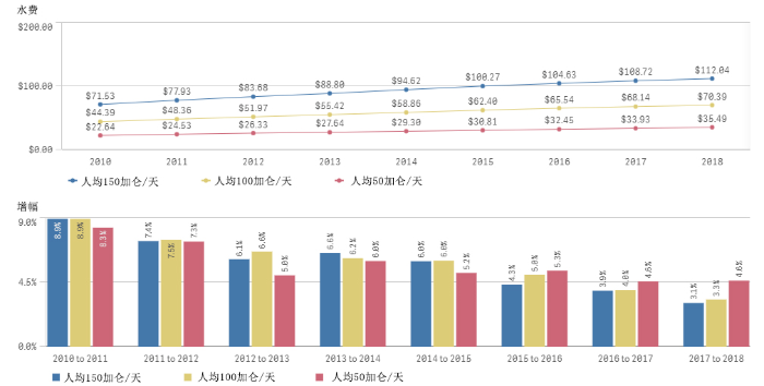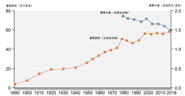 編者按:《2021年聯(lián)合國(guó)世界水發(fā)展報(bào)告》提出,全球新水使用量在過(guò)去100年中增加了6倍,自20世紀(jì)80年代以來(lái)以每年約1%的速度增加。預(yù)計(jì)至2050年全球用水量仍將以類似的速度繼續(xù)增長(zhǎng),且增長(zhǎng)主要集中在中低收入國(guó)家,尤其是新興經(jīng)濟(jì)體[1]。 為進(jìn)一步把握好我國(guó)水資源未來(lái)需求趨勢(shì),我們深入分析研究了一些典型國(guó)家的用水態(tài)勢(shì)變化情況及水資源管理經(jīng)驗(yàn),以期為我國(guó)做好水資源需求研判以及科學(xué)指導(dǎo)水工程規(guī)劃建設(shè)提供參考。本公眾號(hào)將研究成果以系列文章的方式陸續(xù)刊發(fā),本文為系列研究之一,供業(yè)界同仁參考。 美國(guó)用水變化態(tài)勢(shì)對(duì)我國(guó)的啟示 姜富華 邢智慧 紀(jì)興華 一、1950年以來(lái)美國(guó)用水量變化態(tài)勢(shì)分析 (一)1950年以來(lái)美國(guó)用水量變化情況 2015年美國(guó)總用水量約為4449億立方米,其中淡水約為3883億立方米,占比為87%;咸水約為566億立方米,占比為13%。 從1950年至2015年間美國(guó)總用水量的變化情況看,其總體呈先增后降的態(tài)勢(shì)(見圖1)。以1980年為轉(zhuǎn)折點(diǎn),1950-1980年間美國(guó)總用水量隨著人口和經(jīng)濟(jì)的增長(zhǎng)持續(xù)增長(zhǎng),1980年美國(guó)總用水量約為1950年的2.4倍;1980年以后,受產(chǎn)業(yè)結(jié)構(gòu)調(diào)整、技術(shù)進(jìn)步、用水效率提高等因素綜合影響,美國(guó)總用水量呈現(xiàn)了總體下降的態(tài)勢(shì),2015年總用水量比用水高峰的1980年減少了約25%。 美國(guó)淡水取用量與總用水量變化態(tài)勢(shì)一致(見圖2)。1980-2015年間美國(guó)淡水總用水量下降了27%,此期間美國(guó)人口增長(zhǎng)了約42%,GDP增長(zhǎng)了5倍以上[2]。 數(shù)據(jù)來(lái)源:美國(guó)地質(zhì)調(diào)查局統(tǒng)計(jì)。 注:①不同時(shí)段取水量統(tǒng)計(jì)口徑略有差異;②取水量等于毛用水量。 圖1 1950-2015年美國(guó)總?cè)∮盟考胺诸惾∮盟孔兓瘧B(tài)勢(shì) 數(shù)據(jù)來(lái)源:美國(guó)地質(zhì)調(diào)查局統(tǒng)計(jì)。 圖2 1950-2015年美國(guó)淡水取用水量與人口變化態(tài)勢(shì) 有研究[3]繪制了以1950年為基準(zhǔn),至2010年美國(guó)GDP與用水量間的關(guān)系變化情況圖(見圖3)。藍(lán)色線為實(shí)際GDP變化,橙色線為實(shí)際用水量變化,灰色線為考慮產(chǎn)業(yè)結(jié)構(gòu)變化、不考慮技術(shù)改進(jìn)情況下的預(yù)測(cè)用水變化。藍(lán)色線與橙色線的剪刀走向表明:早在1980年,美國(guó)用水量已與GDP脫鉤。藍(lán)色線與灰色線、灰色線與橙色線的剪刀走向表明:導(dǎo)致脫鉤的重要因素是用水效率提升和經(jīng)濟(jì)結(jié)構(gòu)變化。 數(shù)據(jù)來(lái)源:數(shù)據(jù)來(lái)自[3];1950=1 圖3 1950-2010年美國(guó)總用水量與經(jīng)濟(jì)變化關(guān)系分析 (二)主要行業(yè)用水量變化情況 美國(guó)用水類別中,熱電、灌溉、公共和自供工業(yè)用水量是排在前4名的用水戶,其用水總量占美國(guó)總用水量的比重超過(guò)90%,見圖4。本文重點(diǎn)分析多年來(lái)美國(guó)熱電、灌溉、公共和自供工業(yè)用水的變化情況。 數(shù)據(jù)來(lái)源:美國(guó)地質(zhì)調(diào)查局。 圖4 2015年美國(guó)分類取用水量統(tǒng)計(jì) 1.熱電用水變化態(tài)勢(shì) 熱電是美國(guó)最大的用水對(duì)象。2015年美國(guó)熱電用水量約為1838億立方米,占總用水量的41%左右,見圖5。美國(guó)熱電用水基本來(lái)自地表水,且以淡水為主。2015年美國(guó)熱電用水量比2010年降低18%左右,用水效率由2010年的71.9升/千瓦時(shí)降低到2015年的56.8升/千瓦時(shí)。 數(shù)據(jù)來(lái)源:美國(guó)地質(zhì)調(diào)查局。 圖5 1950-2015年美國(guó)熱電用水量變化態(tài)勢(shì) 2.灌溉用水變化態(tài)勢(shì) 美國(guó)灌溉用水量占總用水量的40%左右,僅次于熱電用水。2015年美國(guó)灌溉面積超過(guò)3.5億畝,其中噴灌、微灌面積比重分別為55%和8.6%左右,灌溉總用水量約為1630億立方米(占總用水量的37%左右),地表和地下水源灌溉供水比重分別為52%和48%。由于降雨豐枯變化,美國(guó)灌溉水量年際間有波動(dòng),但從大的變化趨勢(shì)看,1980年以來(lái)總體呈下降趨勢(shì),2015年灌溉水量比1980年減少了21%,見圖6。 數(shù)據(jù)來(lái)源:美國(guó)地質(zhì)調(diào)查局。 圖6 1950-2015年美國(guó)灌溉用水量變化態(tài)勢(shì) 灌溉用水受水資源條件、灌溉面積、種植結(jié)構(gòu)、灌溉設(shè)施、灌溉效率等多種因素影響。據(jù)美國(guó)農(nóng)業(yè)部統(tǒng)計(jì),美國(guó)灌溉面積快速增長(zhǎng),從1890年的不足1821萬(wàn)畝增長(zhǎng)到2017年的3.52億畝左右,見圖7。但與此同時(shí),實(shí)際灌溉用水強(qiáng)度有所下降,1969-2017年單位面積平均灌溉水量從406立方米/畝下降至304立方米/畝,這是農(nóng)業(yè)種植模式調(diào)整、灌溉設(shè)施與技術(shù)采用和灌溉效率提高等綜合作用的結(jié)果。 數(shù)據(jù)來(lái)源:美國(guó)農(nóng)業(yè)部。 圖7 1890-2018年美國(guó)灌溉面積和單位面積灌溉用水量變化態(tài)勢(shì) 美國(guó)灌溉用水結(jié)構(gòu)不斷變化,主要表現(xiàn)為玉米和大豆的灌溉面積顯著