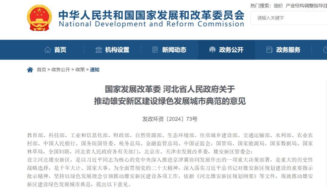 千年大計(jì)綠色為本 打造綠色發(fā)展新高地和城市建設(shè)新標(biāo)桿 ——《關(guān)于推動(dòng)雄安新區(qū)建設(shè)綠色發(fā)展城市典范的意見》解讀 張英健 木其堅(jiān) 近日,國家發(fā)展改革委、河北省人民政府聯(lián)合印發(fā)《關(guān)于推動(dòng)雄安新區(qū)建設(shè)綠色發(fā)展城市典范的意見》(發(fā)改環(huán)資〔2024〕73號(hào),以下簡稱《意見》)。《意見》深入貫徹落實(shí)習(xí)近平總書記對雄安新區(qū)規(guī)劃建設(shè)的重要指示批示精神,堅(jiān)持以綠色發(fā)展理念引領(lǐng)推動(dòng)雄安新區(qū)建設(shè)各項(xiàng)工作,為雄安新區(qū)綠色高質(zhì)量發(fā)展明確了方向路徑,也為全國綠色高質(zhì)量發(fā)展提供了生動(dòng)實(shí)踐和鮮活樣本,具有非常重要的意義。 一、綠色是建設(shè)雄安新區(qū)的鮮明底色 河北雄安新區(qū)的設(shè)立,是千年大計(jì)、國家大事。習(xí)近平總書記從謀劃選址到規(guī)劃建設(shè),親自決策、親自部署、親自推動(dòng),傾注大量心血,為雄安新區(qū)規(guī)劃建設(shè)領(lǐng)航指路、把脈定向。從謀劃設(shè)立之初,習(xí)近平總書記就強(qiáng)調(diào)要堅(jiān)持生態(tài)優(yōu)先、綠色發(fā)展,劃定開發(fā)邊界和生態(tài)紅線,實(shí)現(xiàn)兩線合一,著力建設(shè)綠色、森林、智慧、水城一體的新區(qū)。2017年,雄安新區(qū)在規(guī)劃階段即圍繞綠色發(fā)展專門設(shè)置了綠色生態(tài)發(fā)展指標(biāo)體系、清潔能源利用、資源環(huán)境承載力、大氣環(huán)境綜合治理、綠色建筑標(biāo)準(zhǔn)等10余項(xiàng)專題,這充分體現(xiàn)了雄安新區(qū)在規(guī)劃之初就厚植了“綠色基因”。2023年,習(xí)近平總書記主持召開高標(biāo)準(zhǔn)高質(zhì)量推進(jìn)雄安新區(qū)建設(shè)座談會(huì)并發(fā)表重要講話,強(qiáng)調(diào)要貫徹綠水青山就是金山銀山的理念,堅(jiān)持綠色化、低碳化發(fā)展,把雄安新區(qū)建設(shè)成為綠色發(fā)展城市典范。 《意見》深入貫徹習(xí)近平總書記這一重要指示要求,提出要充分發(fā)揮雄安新區(qū)平地建新城的優(yōu)勢,強(qiáng)化頂層設(shè)計(jì),注重統(tǒng)籌協(xié)調(diào),高標(biāo)準(zhǔn)高質(zhì)量推進(jìn)雄安新區(qū)城市建設(shè)與生態(tài)文明建設(shè),積極穩(wěn)妥推進(jìn)碳達(dá)峰碳中和,加快形成雄安新區(qū)綠色低碳發(fā)展的空間格局、產(chǎn)業(yè)結(jié)構(gòu)、生產(chǎn)方式、生活方式,持續(xù)鞏固生態(tài)環(huán)境治理成效,全面提升生態(tài)安全和綠色發(fā)展水平,建設(shè)人與自然和諧共生的綠色發(fā)展城市典范,樹立新時(shí)代美麗中國雄安樣板。應(yīng)當(dāng)說,《意見》繪制了一幅綠色雄安、美麗雄安畫卷。 二、分階段繪就綠色發(fā)展城市典范建設(shè)藍(lán)圖 雄安新區(qū)肩負(fù)著打造高質(zhì)量發(fā)展全國樣板的歷史重任。雄安新區(qū)圍繞高水平社會(huì)主義現(xiàn)代化城市建設(shè)目標(biāo),堅(jiān)持把綠色作為城市建設(shè)的底色,完善生態(tài)功能,拓展藍(lán)綠空間,推廣低碳模式,建設(shè)數(shù)字城市,打造新時(shí)代綠色發(fā)展新標(biāo)桿。短短6年里,雄安新區(qū)從無到有、從藍(lán)圖到實(shí)景,一座高水平現(xiàn)代化城市正在拔地而起,堪稱奇跡。一系列設(shè)計(jì)之初的綠色設(shè)想也正在變?yōu)楝F(xiàn)實(shí),如雄安自貿(mào)試驗(yàn)區(qū)交流展示中心等充分利用建筑光伏一體化和地源熱泵技術(shù),實(shí)現(xiàn)建筑電力能源的自給自足,一批高品質(zhì)的綠色學(xué)校、綠色醫(yī)院、綠色辦公、綠色住宅、綠色工業(yè)建筑等示范場景在近幾年也都逐步成型。下一階段,高標(biāo)準(zhǔn)高水平建設(shè)雄安新區(qū),也必須要牢牢把握黨中央關(guān)于雄安新區(qū)的功能定位、使命任務(wù)和原則要求,提高政治站位,保持歷史耐心,處理好近期目標(biāo)和中遠(yuǎn)期目標(biāo)、城市建設(shè)速度和人口聚集規(guī)模、產(chǎn)業(yè)轉(zhuǎn)移和產(chǎn)業(yè)升級、政府和市場、承接北京非首都功能疏解和城市自身發(fā)展、城市建設(shè)和周邊鄉(xiāng)村振興等重大關(guān)系,確保雄安新區(qū)建設(shè)和發(fā)展的正確方向。 《意見》堅(jiān)持把綠色作為高質(zhì)量發(fā)展的普遍形態(tài),堅(jiān)持生態(tài)優(yōu)先、綠色發(fā)展,科學(xué)提出了雄安新區(qū)建設(shè)綠色發(fā)展城市典范近、中、遠(yuǎn)期建設(shè)目標(biāo)。近期目標(biāo)注重夯實(shí)雄安新區(qū)綠色發(fā)展基礎(chǔ)。這一時(shí)期的工作重點(diǎn)主要是生態(tài)空間格局的構(gòu)建,到2030年“一淀、三帶、九片、多廊”的生態(tài)空間格局將初步構(gòu)建,城淀共生共榮的風(fēng)貌基本形成。中期目標(biāo)更加注重綠色軟實(shí)力的構(gòu)建。這一時(shí)期聚焦綠色產(chǎn)業(yè)、環(huán)境質(zhì)量、生態(tài)宜居的全面提升,到2035年城市綠化、環(huán)境質(zhì)量、藍(lán)綠空間都得到根本改善和顯著提升,綠色低碳現(xiàn)代產(chǎn)業(yè)格局初步確立,能效、碳排放等指標(biāo)達(dá)到國內(nèi)領(lǐng)先水平,成為綠色發(fā)展新高地和城市建設(shè)新標(biāo)桿。遠(yuǎn)期目標(biāo)旨在把雄安