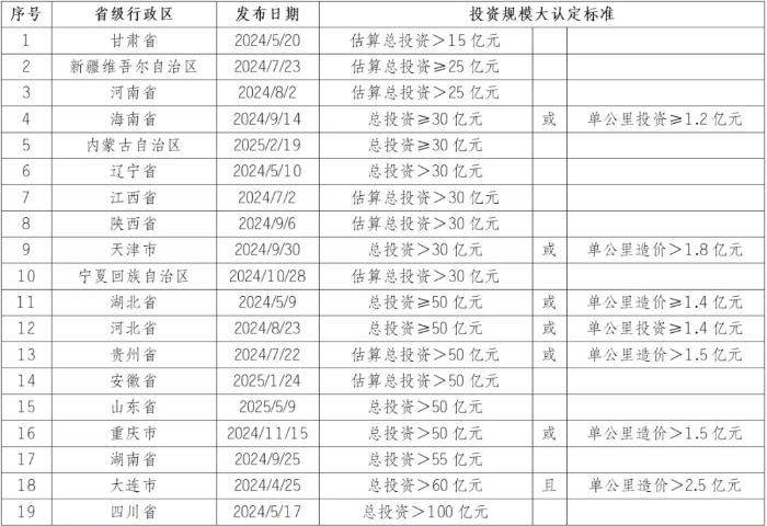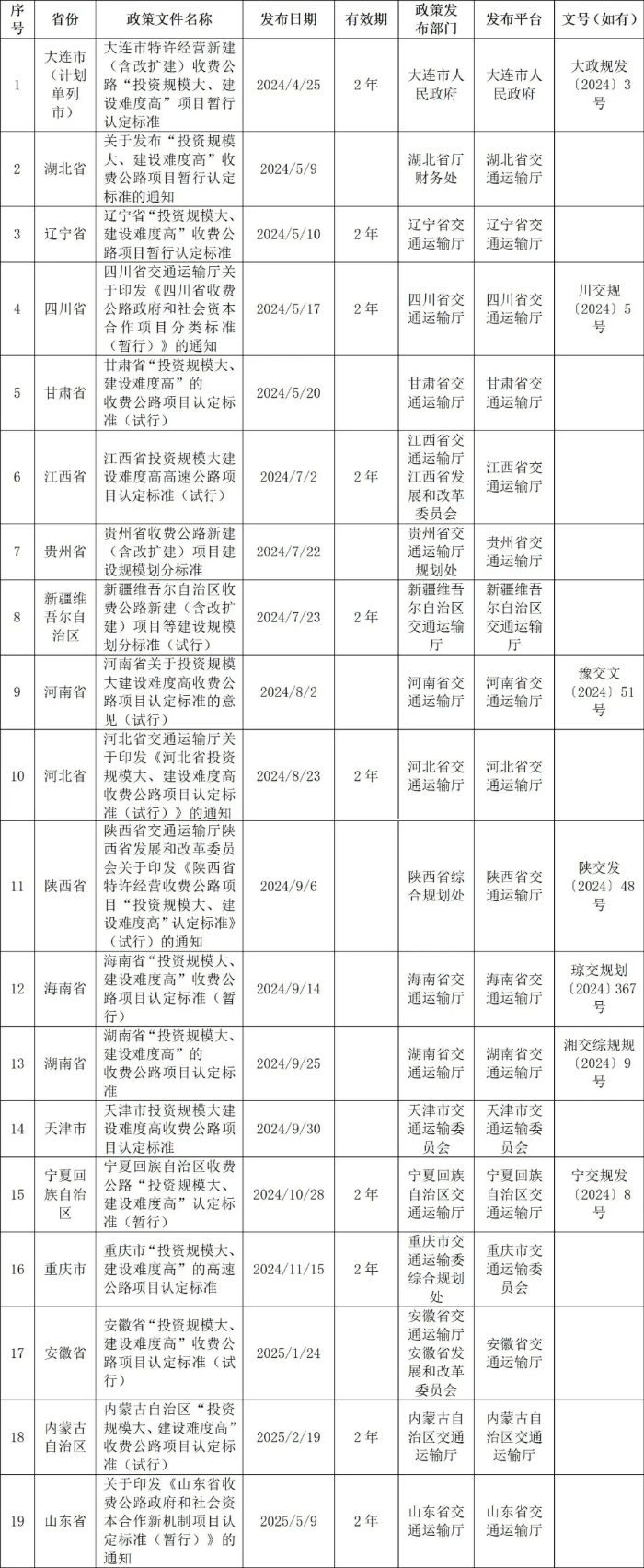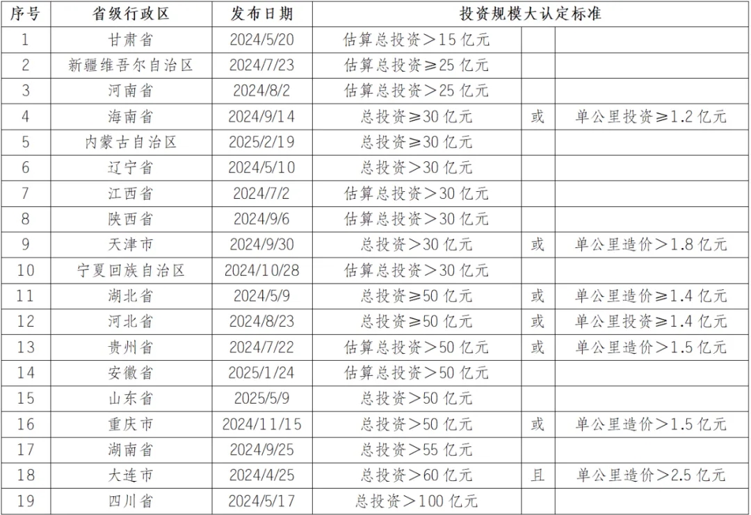 編者按:2023年11月,《關(guān)于規(guī)范實施政府和社會資本合作新機制的指導(dǎo)意見》(國辦函〔2023〕115號)發(fā)布,投資規(guī)模大、建設(shè)難度高的收費公路等項目被列為“積極創(chuàng)造條件、支持民營企業(yè)參與”的項目,不強制要求民營企業(yè)在PPP項目公司具體持股比例。除此類項目外,其他收費公路項目需滿足“民營企業(yè)股權(quán)占比原則上不低于35%”。PPP新機制發(fā)布近兩年來,各地陸續(xù)出臺對“投資規(guī)模大、建設(shè)難度高”收費公路項目量化認定標(biāo)準(zhǔn)。本研究系統(tǒng)梳理截至2025年9月底全國各地已正式發(fā)布的全部官方標(biāo)準(zhǔn),基于投資規(guī)模與建設(shè)難度兩個維度開展比較分析。各地出臺的認定標(biāo)準(zhǔn)是PPP新機制下地方政府精細化、差異化治理的具體實踐,為市場主體提供了投資指引,同時成為觀察區(qū)域基建重點與政策導(dǎo)向的重要窗口。本文是PPP新機制觀察系列研究:收費公路“投資規(guī)模大、建設(shè)難度高”認定標(biāo)準(zhǔn)的第一部分,闡述認定標(biāo)準(zhǔn)發(fā)布整體情況,分析“投資規(guī)模大”的具體界定標(biāo)準(zhǔn),供業(yè)界同仁參考。 “PPP新機制觀察”系列研究 收費公路“投資規(guī)模大”認定標(biāo)準(zhǔn) 郭艷鑫 張雪飛 伍迪 摘要:本研究系統(tǒng)梳理截至2025年9月底全國各地已正式發(fā)布的“投資規(guī)模大、建設(shè)難度高”收費公路項目認定標(biāo)準(zhǔn),研究發(fā)現(xiàn),在“投資規(guī)模大”方面,投資規(guī)模閾值分布于15億元至100億元之間,其設(shè)定與地方GDP、公路固定資產(chǎn)投資等經(jīng)濟指標(biāo)呈現(xiàn)正相關(guān),反映地方經(jīng)濟實力與基建需求的深層影響,本文為理解地方PPP治理邏輯、區(qū)域差異及政策協(xié)同提供了實踐依據(jù)。 關(guān)鍵詞:PPP;特許經(jīng)營;新機制;收費公路;投資規(guī)模大;建設(shè)難度高;認定標(biāo)準(zhǔn);區(qū)域差異 2023年11月,國務(wù)院辦公廳轉(zhuǎn)發(fā)國家發(fā)展改革委、財政部《關(guān)于規(guī)范實施政府和社會資本合作新機制的指導(dǎo)意見》(國辦函〔2023〕115號,以下簡稱《指導(dǎo)意見》),標(biāo)志著我國政府和社會資本合作(PPP)事業(yè)邁入全新發(fā)展階段。PPP新機制明確三大核心導(dǎo)向,即社會資本優(yōu)先選擇民營企業(yè)、回報機制聚焦使用者付費、實施模式全部采用特許經(jīng)營。其中,最大程度鼓勵民營企業(yè)參與,既是貫徹落實黨中央、國務(wù)院決策部署的關(guān)鍵舉措,也是引導(dǎo)市場回歸PPP初衷本源、進一步調(diào)動民間投資積極性的重要抓手。 《指導(dǎo)意見》明確,“最大程度鼓勵民營企業(yè)參與政府和社會資本合作新建(含改擴建)項目”,這一要求既契合我國引入PPP模式的初衷,也順應(yīng)了當(dāng)前激發(fā)民間資本投資活力的客觀需求。同時,考慮到國有企業(yè)是我國市場主體的重要組成部分,《指導(dǎo)意見》并未對國有企業(yè)參與PPP項目采取“一刀切”式禁止,而是制定了《支持民營企業(yè)參與的特許經(jīng)營新建(含改擴建)項目清單(2023年版)》(以下簡稱《清單》)。該《清單》依據(jù)市場化程度、公共屬性強弱、是否具備自然壟斷性等特征,對新建(含改擴建)項目進行分類設(shè)置民營企業(yè)參與要求,將“屬于市場的還給市場”,充分體現(xiàn)新機制在兼顧PPP項目公益性的同時、最大化釋放市場效率的政策導(dǎo)向。具體而言,市場化程度較高、公共屬性較弱的項目,應(yīng)由民營企業(yè)獨資或控股;關(guān)系國計民生、公共屬性較強的項目,民營企業(yè)股權(quán)占比原則上不低于35%;少數(shù)涉及國家安全、公共屬性強且具備自然壟斷屬性的項目,需積極創(chuàng)造條件支持民營企業(yè)參與。 值得關(guān)注的是,《清單》對收費公路項目的分類較為特殊:不符合“投資規(guī)模大、建設(shè)難度高”情形的收費公路項目,歸為“關(guān)系國計民生、公共屬性較強”的第二類項目,民營企業(yè)股權(quán)占比原則上不低于35%;“投資規(guī)模大、建設(shè)難度高”的收費公路等項目,則歸為第三類項目,需通過積極創(chuàng)造條件支持民營企業(yè)參與,但未強制要求民營企業(yè)參股比例。 為明確“投資規(guī)模大、建設(shè)難度高”的認定邊界,部分地區(qū)陸續(xù)公開發(fā)布收費公路項目量化認定細則。截至2025年9月底,全國已有19個省級行政區(qū)和計劃單列市出臺了收費公路“投資規(guī)模大、建設(shè)難度高”認定標(biāo)準(zhǔn)(以下簡稱認定標(biāo)準(zhǔn)),不同區(qū)域的認定標(biāo)準(zhǔn)既存在差異也具備共性。本文聚焦各地出臺的相關(guān)認定標(biāo)準(zhǔn)開展研究,并重點關(guān)注“投資規(guī)模大”維度的指標(biāo),形成若干思考,旨在為業(yè)界提供參考借鑒。 一、認定標(biāo)準(zhǔn)發(fā)布總體情況 截至2025年9月底,全國已有18個省級行政區(qū)發(fā)布收費公路“投資規(guī)模大、建設(shè)難度高”認定標(biāo)準(zhǔn)。其發(fā)布時間范圍為2024年5月至2025年5月,已發(fā)布認定標(biāo)準(zhǔn)的各省級行政區(qū)域具體如圖1所示,較深的顏色代表出臺的時間較早。另有1個計劃單列市(大連市)在2024年4月發(fā)布認定標(bi