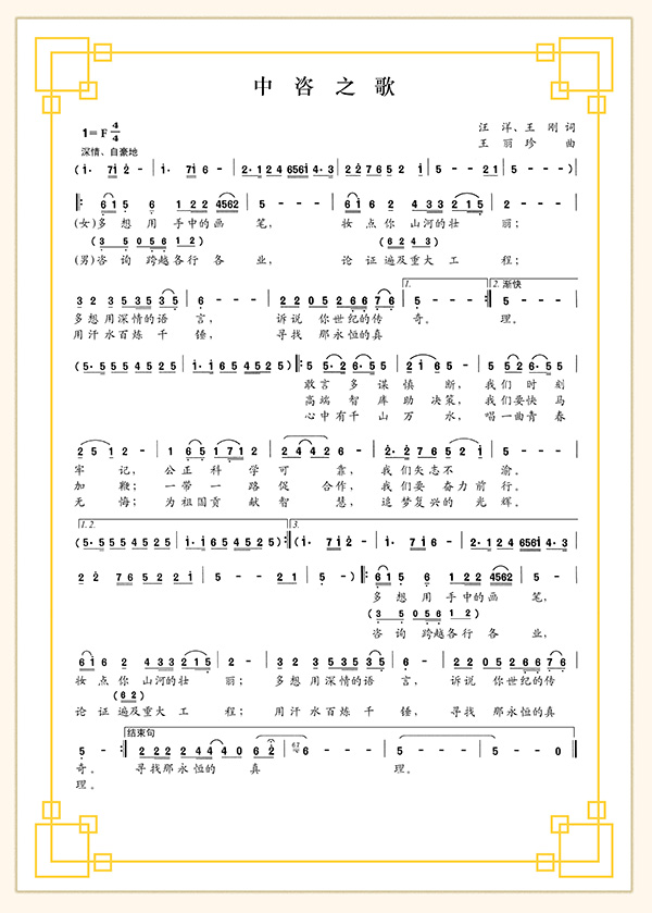 《中咨之歌》旋律優(yōu)美、抒情大氣,易上口傳唱,歌詞凝煉了公司服務(wù)國(guó)家、貢獻(xiàn)社會(huì)的歷史傳承,凸顯了新時(shí)期高端智庫建設(shè)的宗旨目標(biāo),展現(xiàn)了中咨人志存高遠(yuǎn)、矢志不渝、開拓創(chuàng)新、追夢(mèng)筑夢(mèng)的精神風(fēng)貌。曾獲得中國(guó)職工音樂家協(xié)會(huì)和國(guó)資委新聞中心聯(lián)合舉辦的2016中國(guó)職工好歌曲創(chuàng)作征集評(píng)選活動(dòng)“優(yōu)秀創(chuàng)作歌曲”表彰,并在權(quán)威雜志《歌曲》刊發(fā),中國(guó)曲譜網(wǎng)選登發(fā)表。
