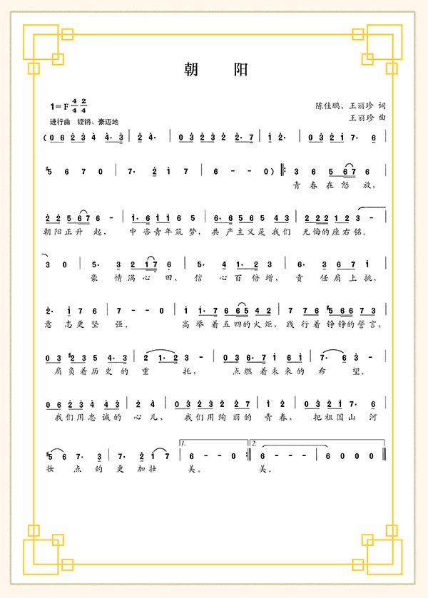 《朝陽》是一首青年人的歌曲,曲風(fēng)為進(jìn)行曲,堅(jiān)定豪邁、有力、朝氣蓬勃,體現(xiàn)了新一代中咨青年牢記囑托、砥礪前行,忠于理想、不斷進(jìn)取的精神風(fēng)貌,以堅(jiān)定的理想信念,勇立時(shí)代潮頭;以過硬的業(yè)務(wù)本領(lǐng),挑起時(shí)代重?fù)?dān);以飽滿的工作熱情,甘做時(shí)代激流。此曲被《中國(guó)曲譜網(wǎng)》登錄,此次創(chuàng)作是我公司為職工歌曲創(chuàng)作的一次展示,展現(xiàn)了廣大職工開拓創(chuàng)新、愛崗敬業(yè)、爭(zhēng)創(chuàng)一流的精神豐貌。